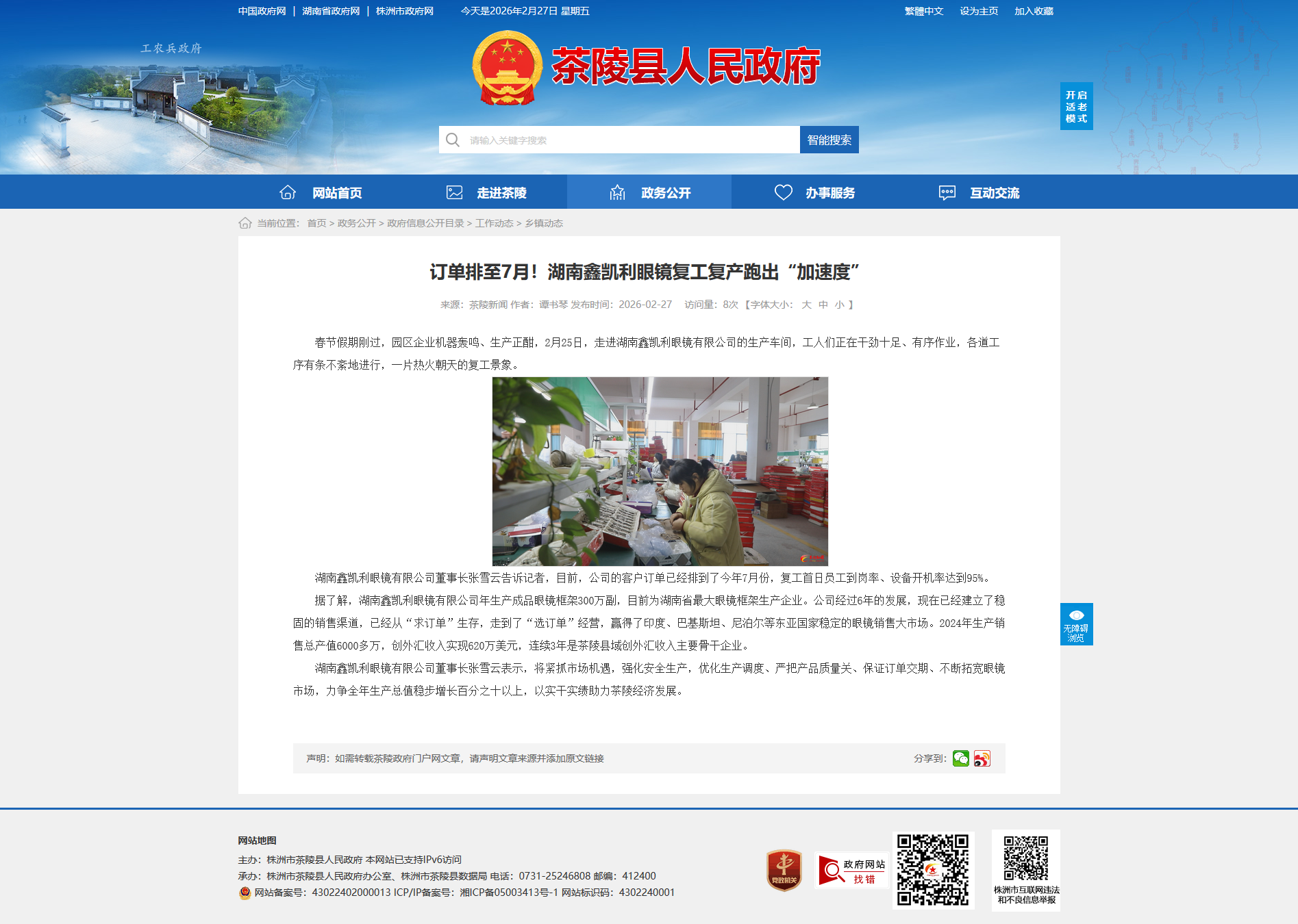据了解,湖南鑫凯利眼镜有限公司年生产成品眼镜框架300万副,目前为湖南省最大眼镜框架生产企业。公司经过6年的发展,现在已经建立了稳固的销售渠道,已经从“求订单”生存,走到了“选订单”经营,赢得了印度、巴基斯坦、尼泊尔等东亚国家稳定的眼镜销售大市场。2024年生产销售总产值6000多万,创外汇收入实现620万美元,连续3年是茶陵县域创外汇收入主要骨干企业。