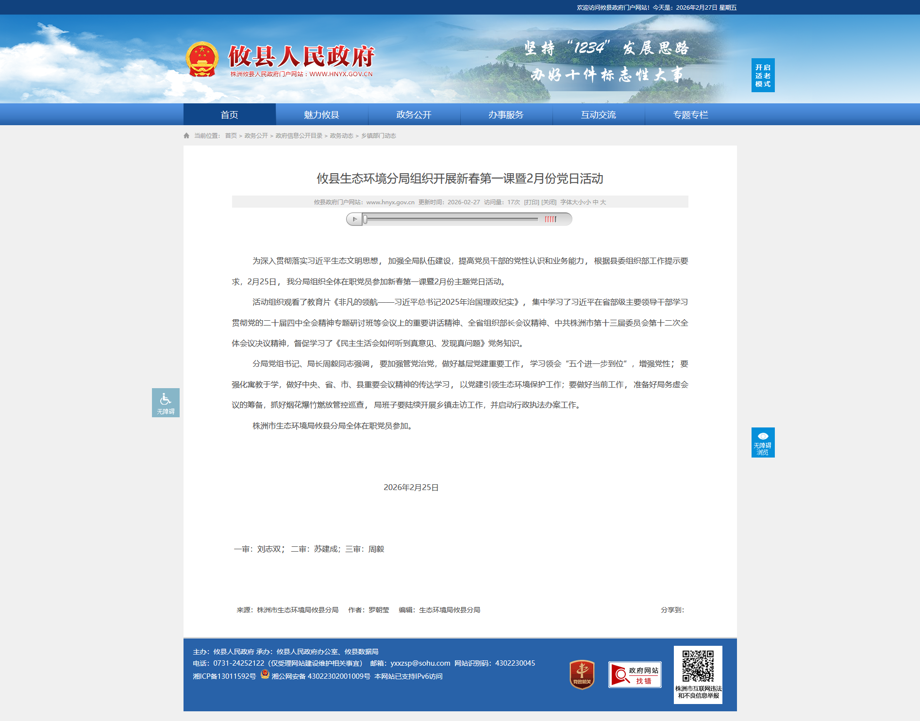 为深入贯彻落实习近平生态文明思想,加强全局队伍建设,提高党员干部的党性认识和业务能力,根据县委组织部工作提示要求,2月25日,我分局组织全体在职党员参加新春第一课暨2月份主题党日活动。