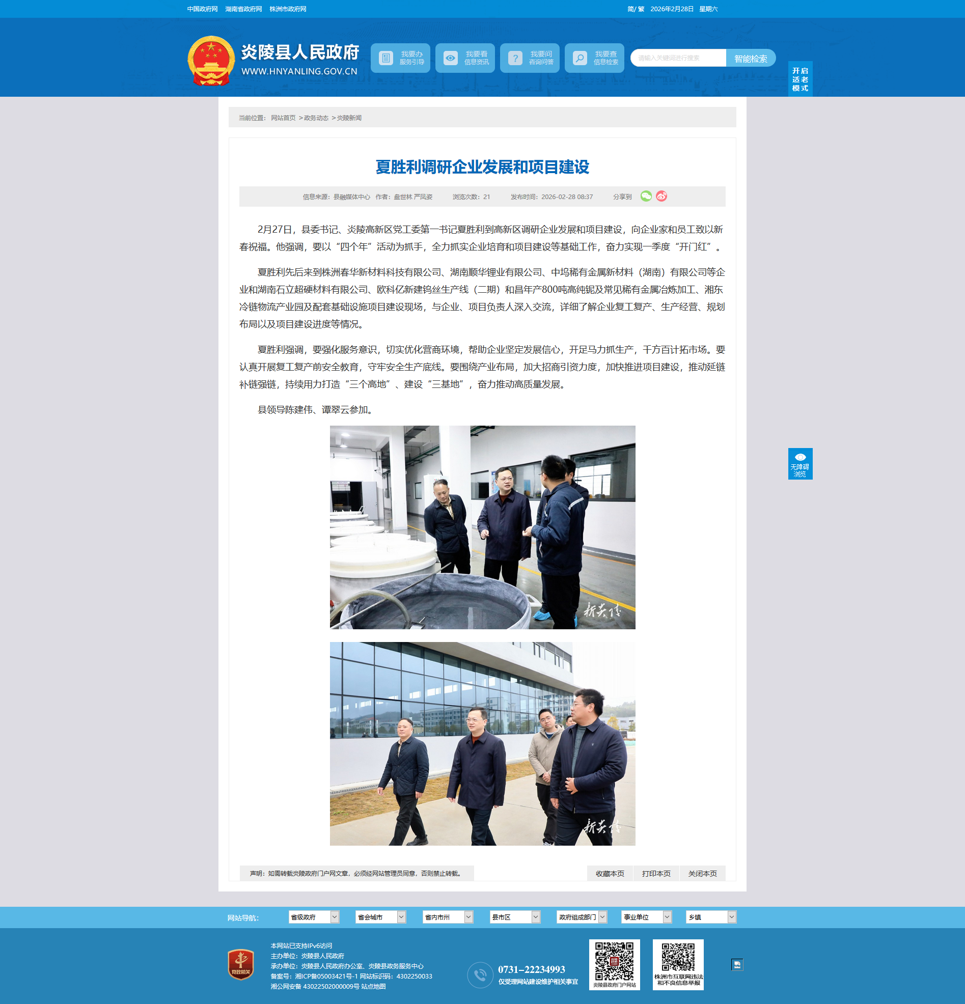 2月27日,县委书记、炎陵高新区党工委第一书记夏胜利到高新区调研企业发展和项目建设,向企业家和员工致以新春祝福。他强调,要以“四个年”活动为抓手,全力抓实企业培育和项目建设等基础工作,奋力实现一季度“开门红”。