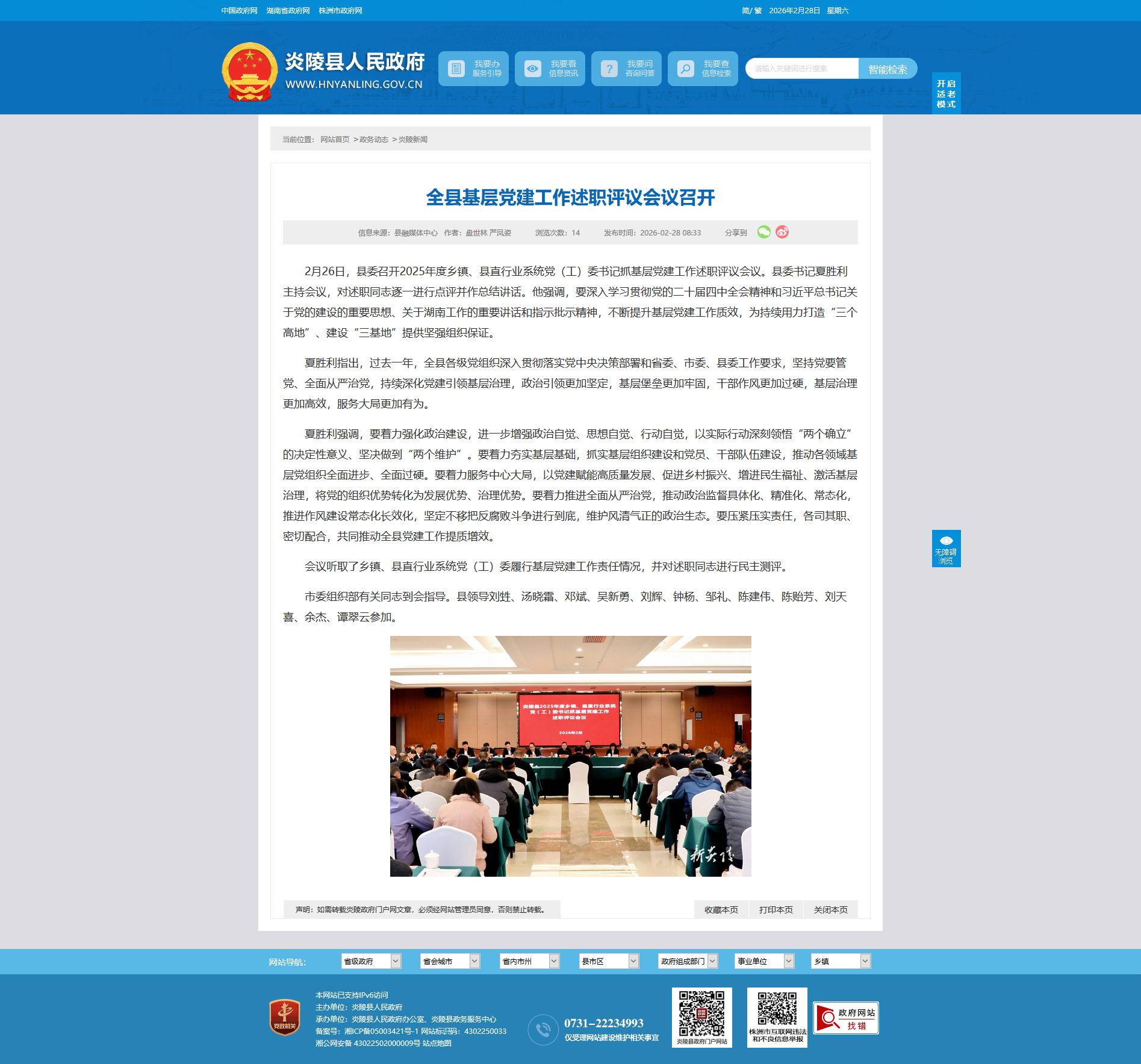 2月26日,县委召开2025年度乡镇、县直行业系统党(工)委书记抓基层党建工作述职评议会议。县委书记夏胜利主持会议,对述职同志逐一进行点评并作总结讲话。他强调,要深入学习贯彻党的二十届四中全会精神和习近平总书记关于党的建设的重要思想、关于湖南工作的重要讲话和指示批示精神,不断提升基层党建工作质效,为持续用力打造“三个高地”、建设“三基地”提供坚强组织保证。