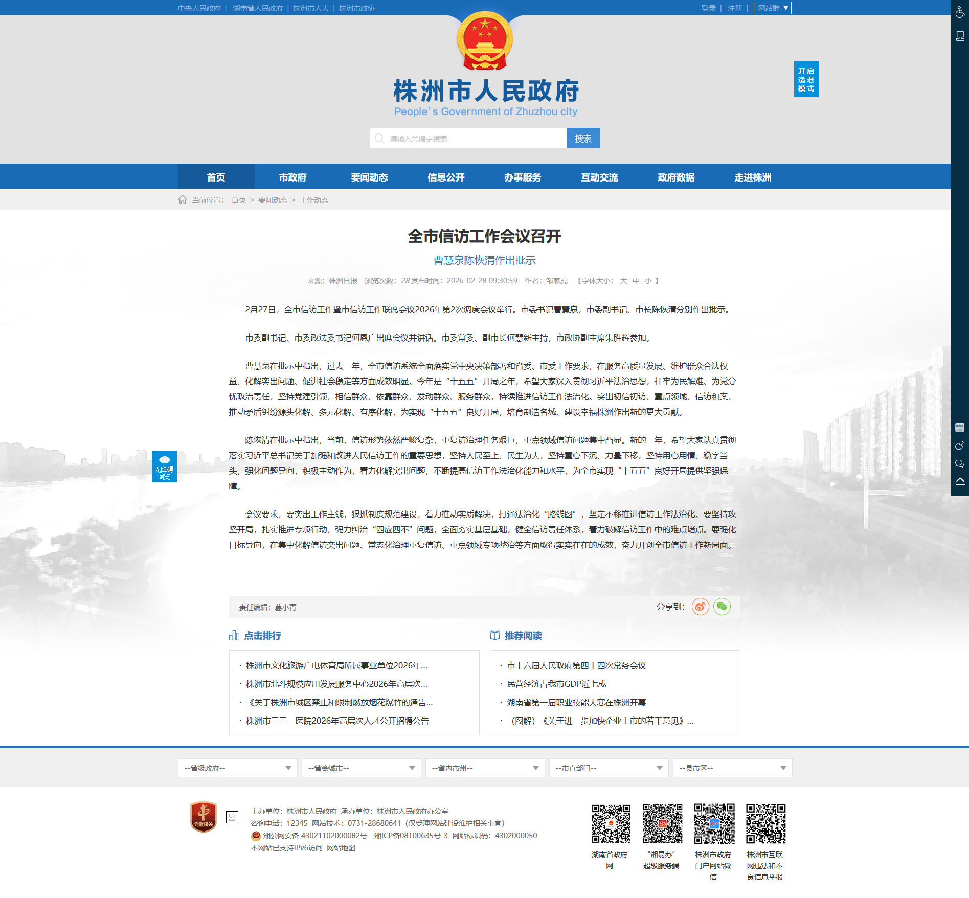 2月27日,全市信访工作暨市信访工作联席会议2026年第2次调度会议举行。市委书记曹慧泉,市委副书记、市长陈恢清分别作出批示。