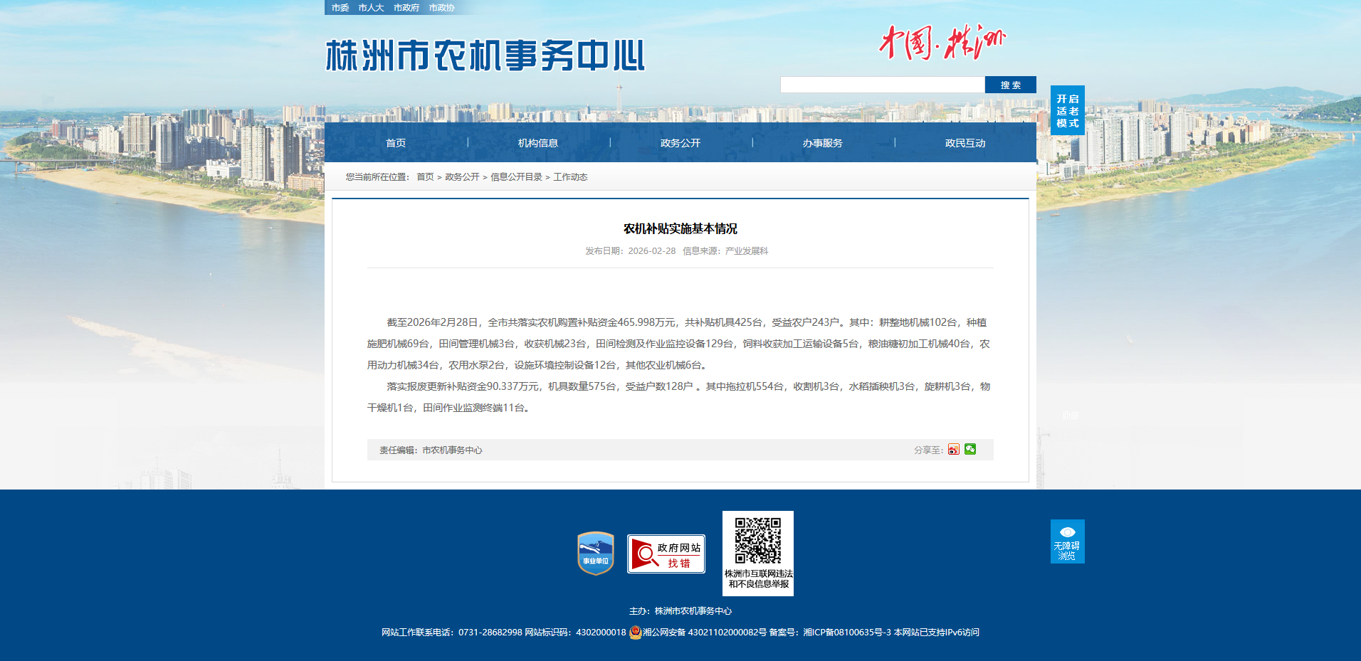 截至2026年2月28日,全市共落实农机购置补贴资金465.998万元,共补贴机具425台,受益农户243户。其中:耕整地机械102台,种植施肥机械69台,田间管理机械3台,收获机械23台,田间检测及作业监控设备129台,饲料收获加工运输设备5台,粮油糖初加工机械40台,农用动力机械34台,农用水泵2台,设施环境控制设备12台,其他农业机械6台。