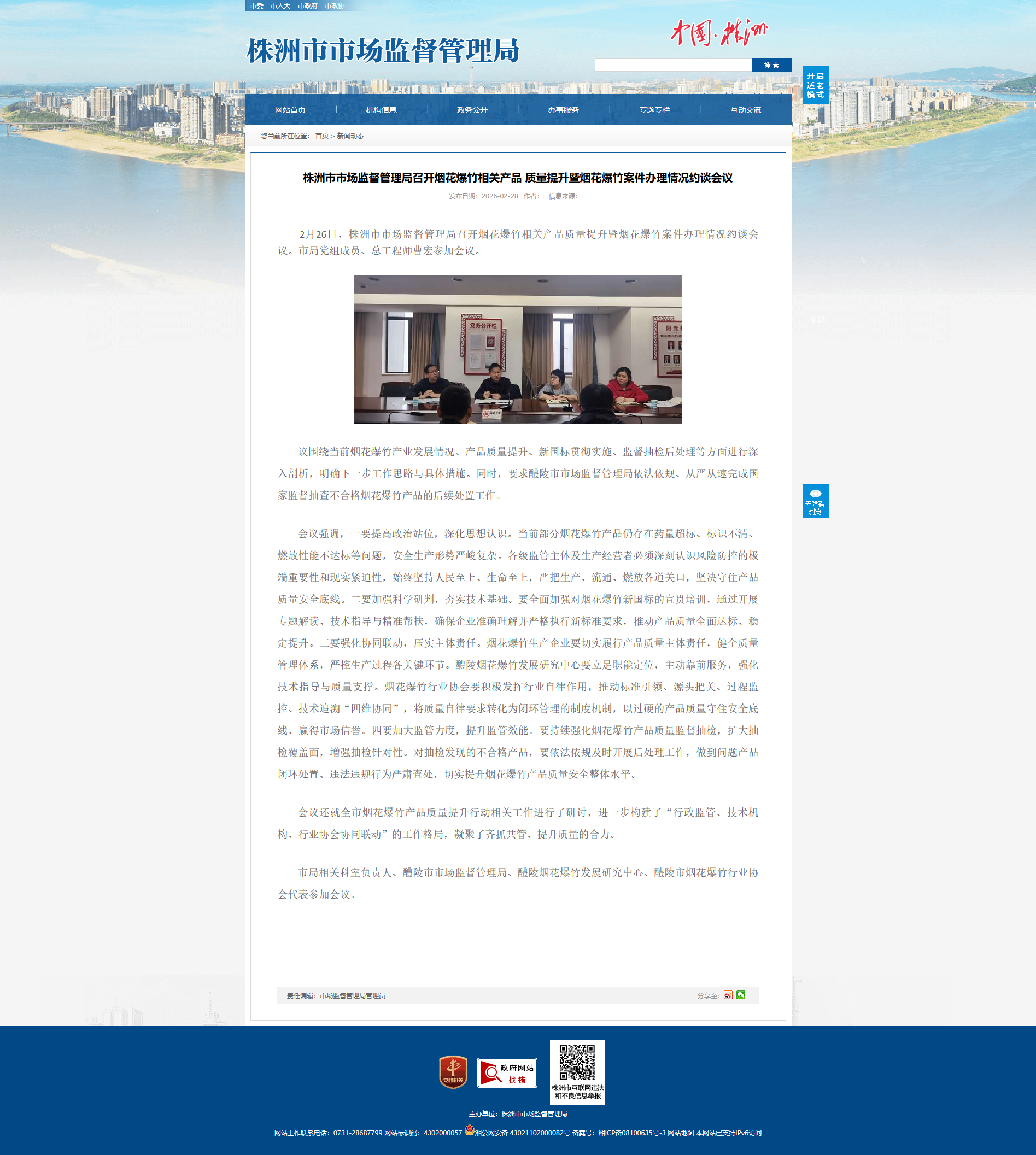 2月26日,株洲市市场监督管理局召开烟花爆竹相关产品质量提升暨烟花爆竹案件办理情况约谈会议。市局党组成员、总工程师曹宏参加会议。