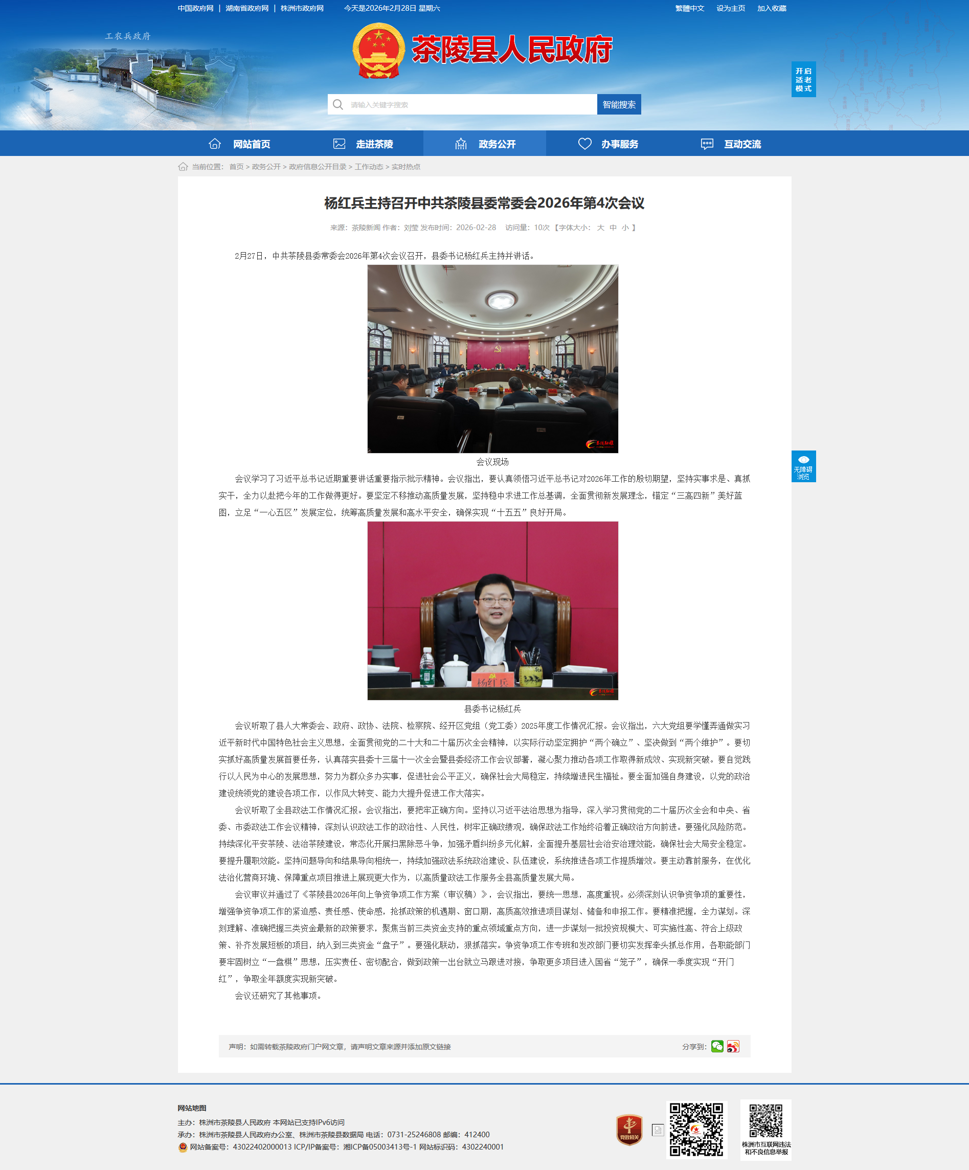 2月27日,中共茶陵县委常委会2026年第4次会议召开,县委书记杨红兵主持并讲话。