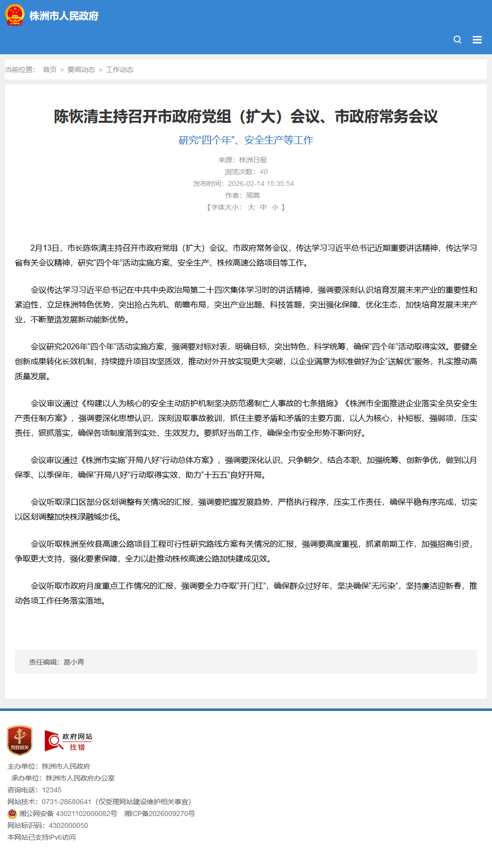 2月13日,市长陈恢清主持召开市政府党组(扩大)会议、市政府常务会议,传达学习习近平总书记近期重要讲话精神,传达学习省有关会议精神,研究“四个年”活动实施方案、安全生产、株攸高速公路项目等工作。