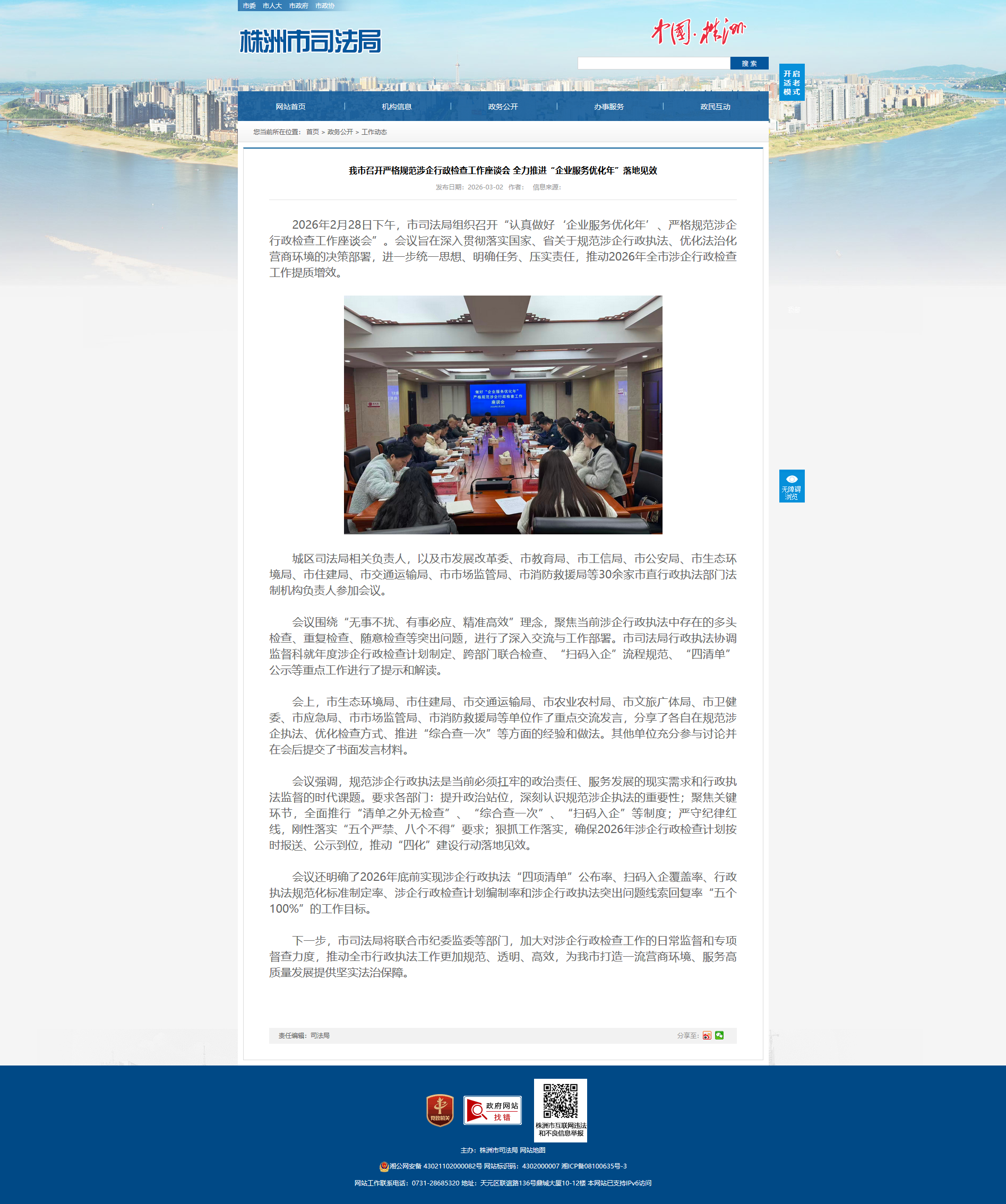2026年2月28日下午,市司法局组织召开“认真做好‘企业服务优化年’、严格规范涉企行政检查工作座谈会”。会议旨在深入贯彻落实国家、省关于规范涉企行政执法、优化法治化营商环境的决策部署,进一步统一思想、明确任务、压实责任,推动2026年全市涉企行政检查工作提质增效。