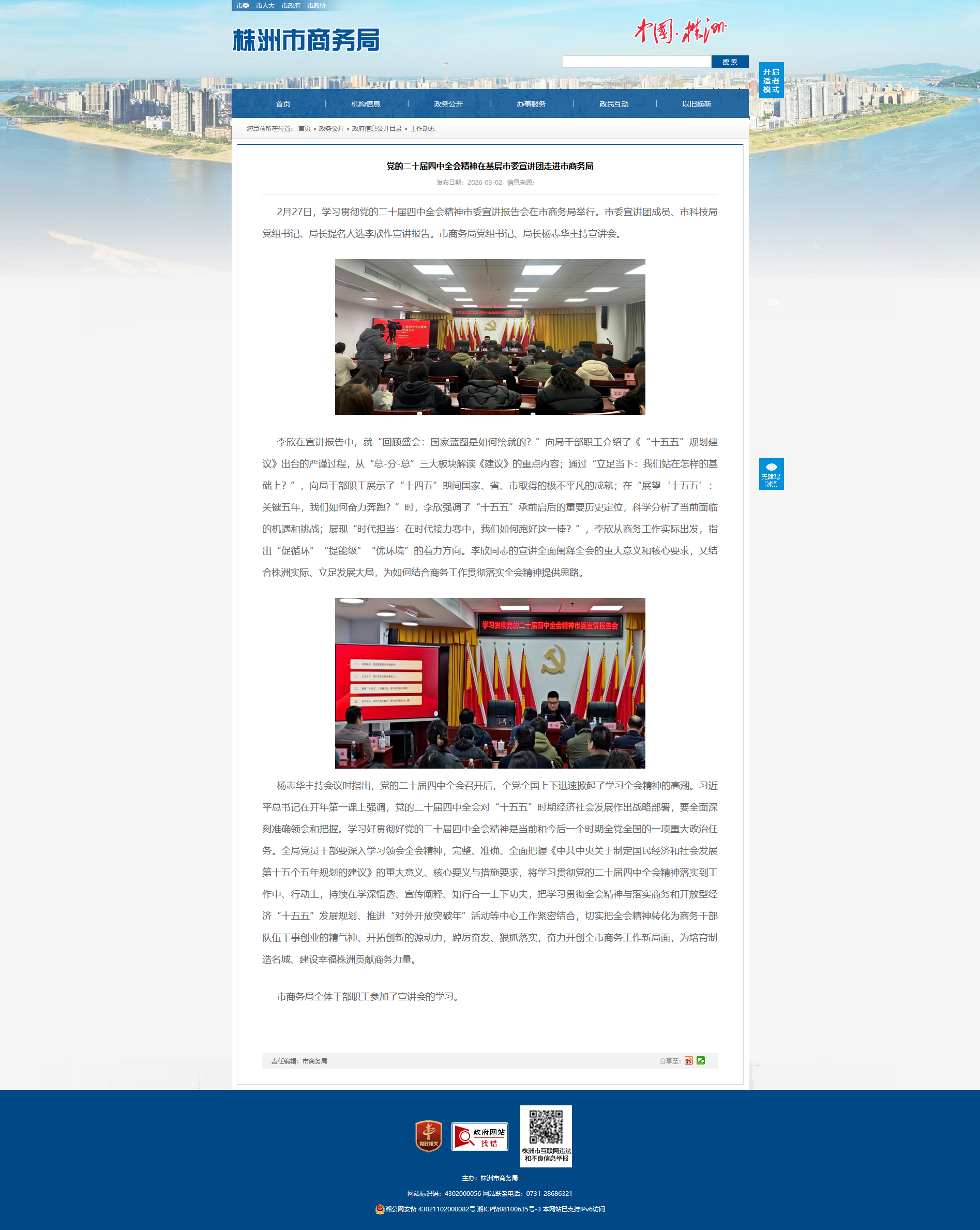 2月27日,学习贯彻党的二十届四中全会精神市委宣讲报告会在市商务局举行。市委宣讲团成员、市科技局党组书记、局长提名人选李欣作宣讲报告。市商务局党组书记、局长杨志华主持宣讲会。