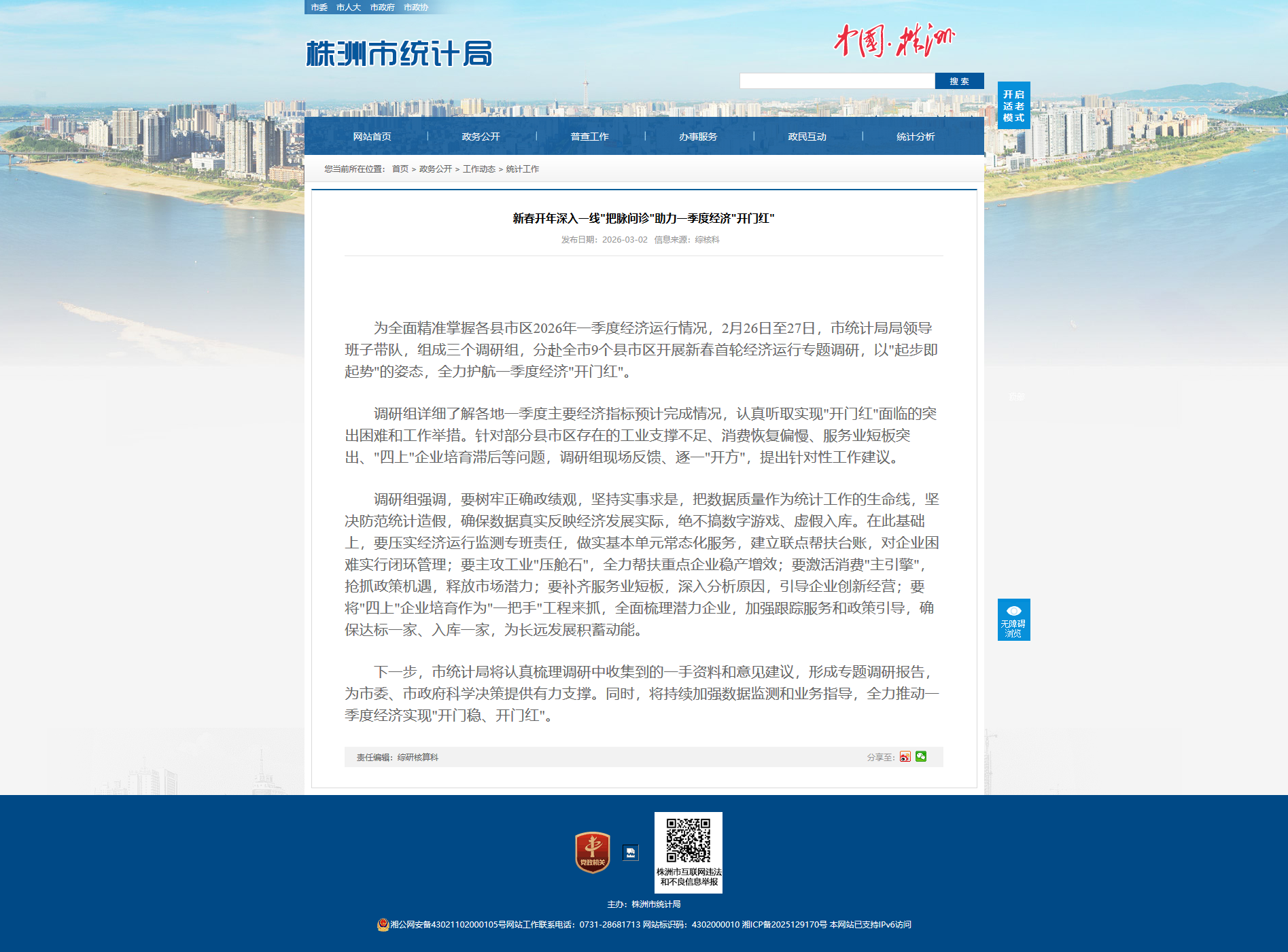 为全面精准掌握各县市区2026年一季度经济运行情况,2月26日至27日,市统计局局领导班子带队,组成三个调研组,分赴全市9个县市区开展新春首轮经济运行专题调研,以"起步即起势"的姿态,全力护航一季度经济"开门红"。