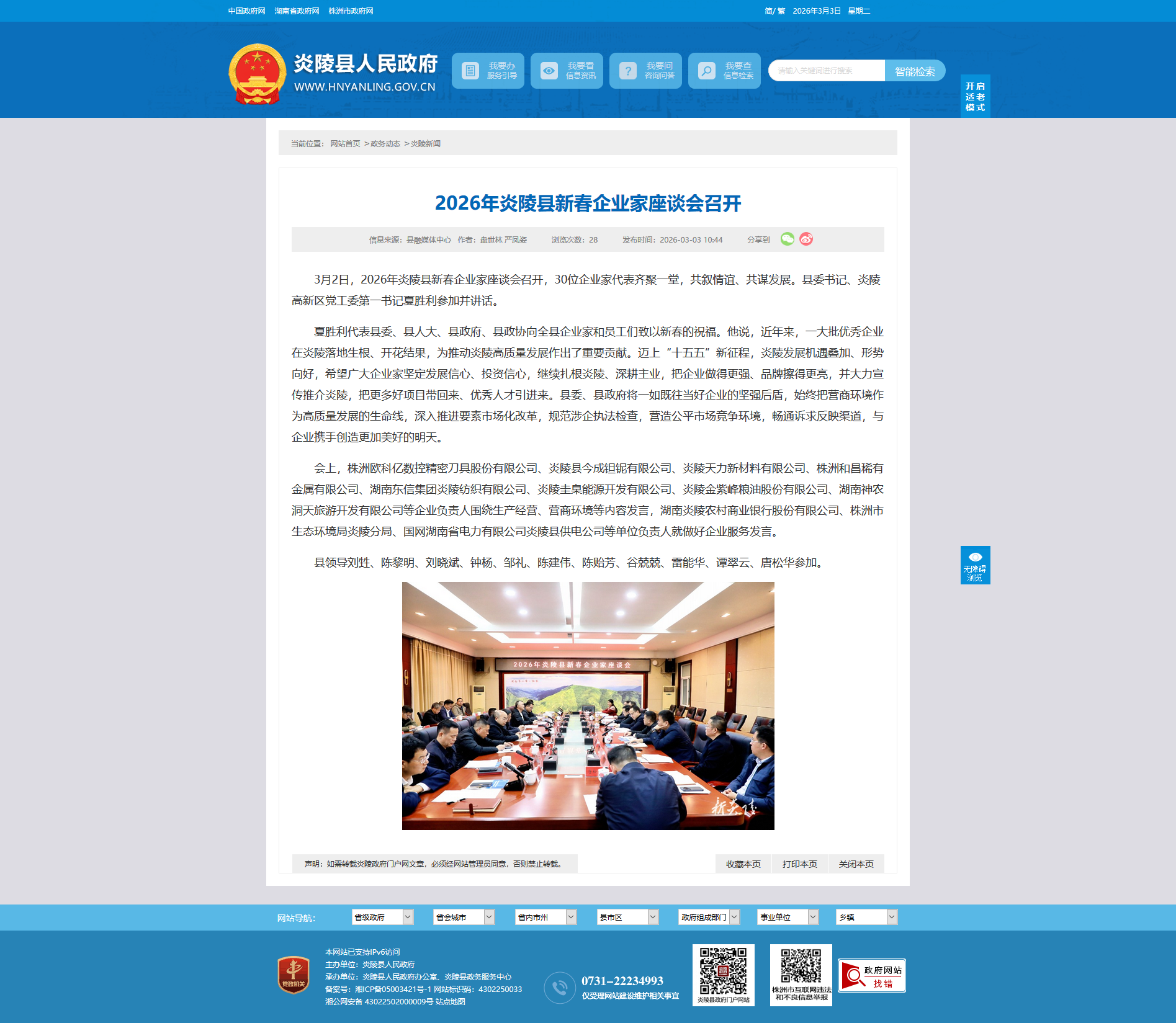 3月2日,2026年炎陵县新春企业家座谈会召开,30位企业家代表齐聚一堂,共叙情谊、共谋发展。县委书记、炎陵高新区党工委第一书记夏胜利参加并讲话。