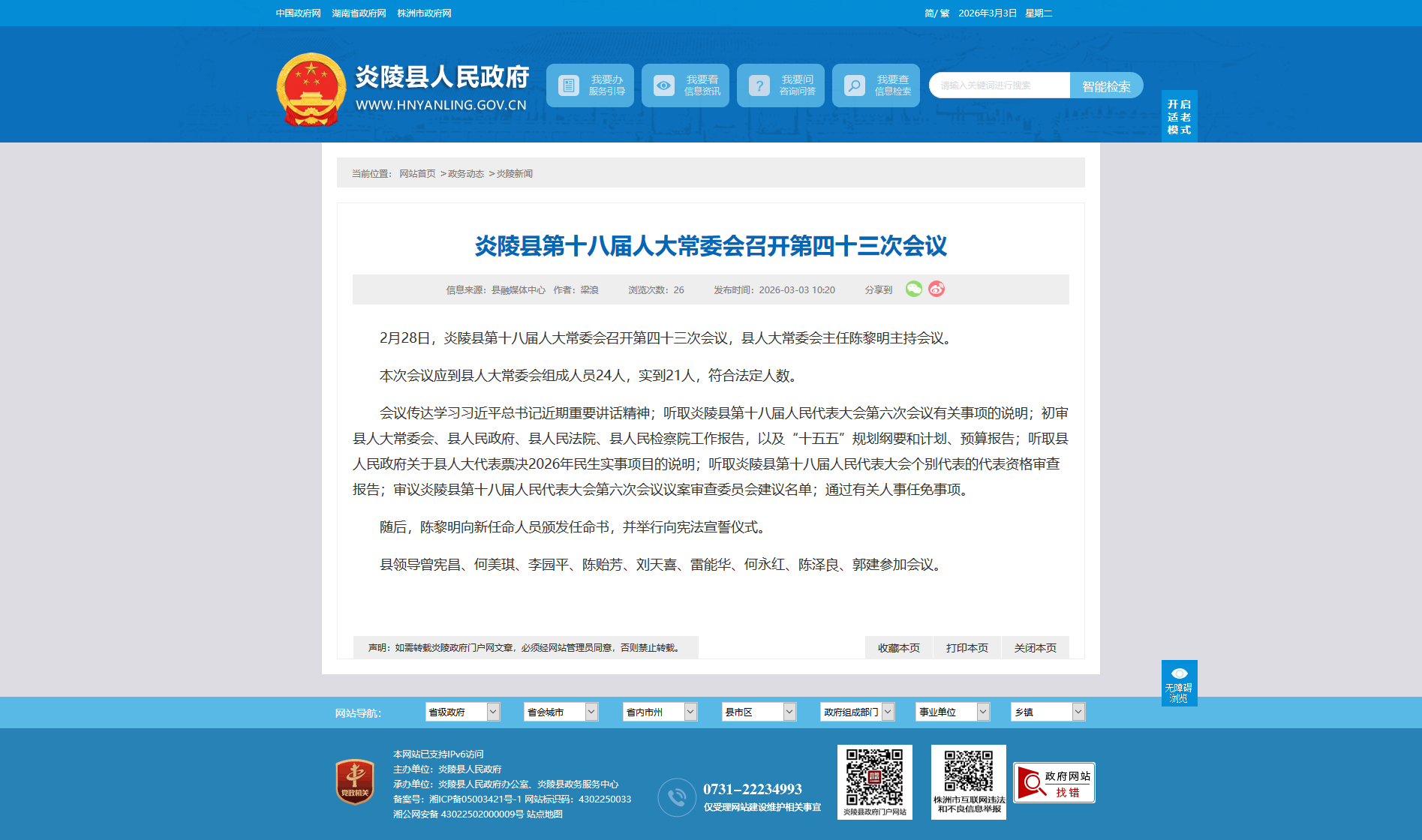 2月28日,炎陵县第十八届人大常委会召开第四十三次会议,县人大常委会主任陈黎明主持会议。