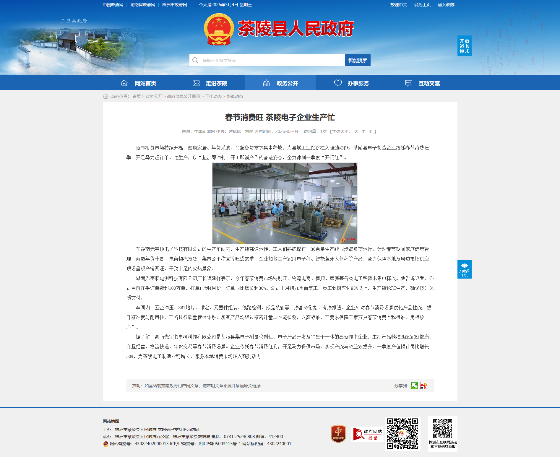 据了解,湖南光宇顺电测科技有限公司是茶陵县集电子测量仪制造、电子产品开发及销售于一体的高新技术企业,主打产品精准匹配家庭健康、商超经营、物流快递、年货交易等春节消费场景。企业依托春节消费红利,开足马力保供市场,实现产能与效益双提升,一季度产值预计同比增长50%,为茶陵电子制造业稳增长、服务本地消费市场注入强劲动力。