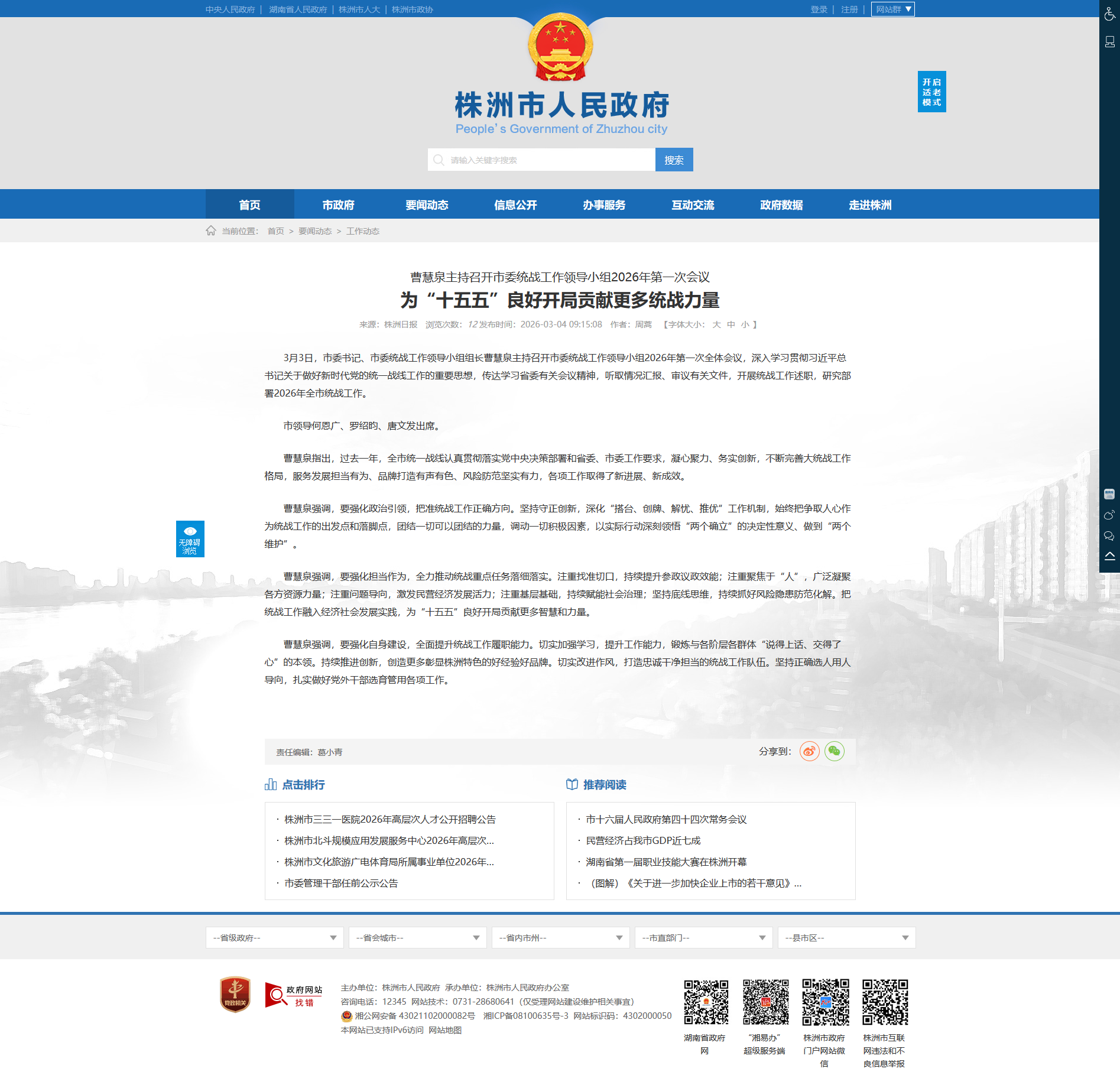 曹慧泉强调,要强化自身建设,全面提升统战工作履职能力。切实加强学习,提升工作能力,锻炼与各阶层各群体“说得上话、交得了心”的本领。持续推进创新,创造更多彰显株洲特色的好经验好品牌。切实改进作风,打造忠诚干净担当的统战工作队伍。坚持正确选人用人导向,扎实做好党外干部选育管用各项工作。