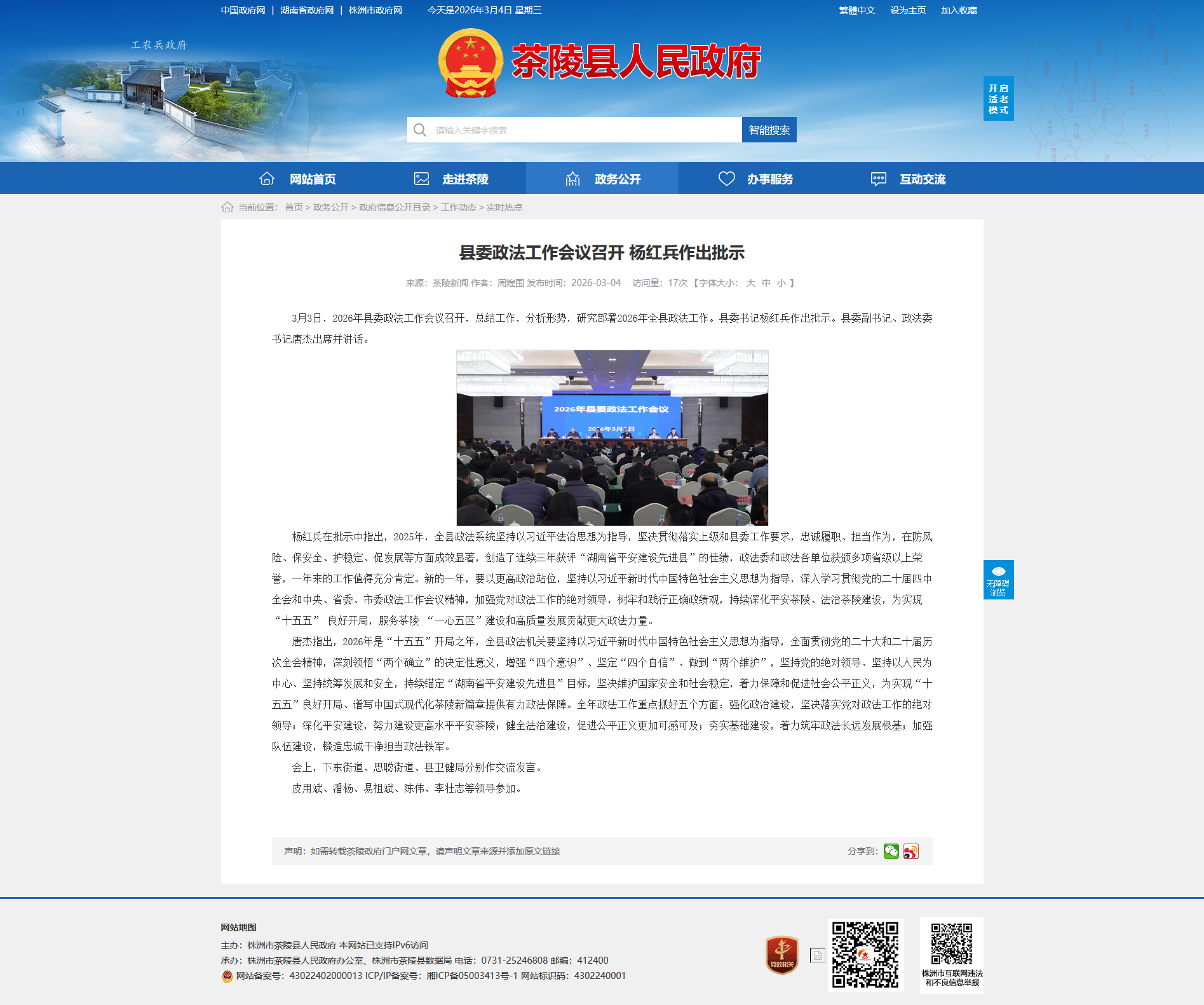 3月3日,2026年县委政法工作会议召开,总结工作,分析形势,研究部署2026年全县政法工作。县委书记杨红兵作出批示。县委副书记、政法委书记唐杰出席并讲话。