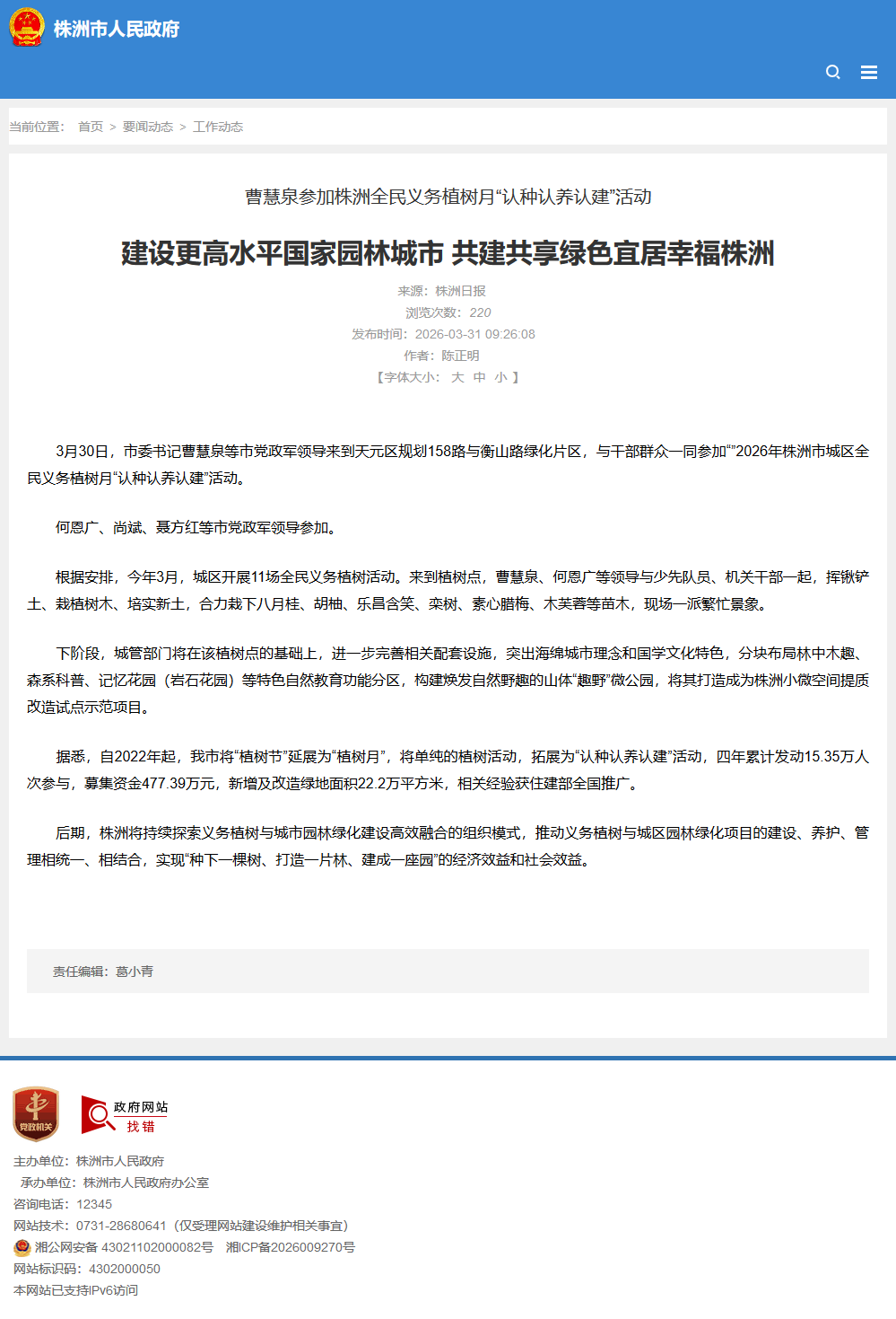 3月30日,市委书记曹慧泉等市党政军领导来到天元区规划158路与衡山路绿化片区,与干部群众一同参加“”2026年株洲市城区全民义务植树月“认种认养认建”活动。