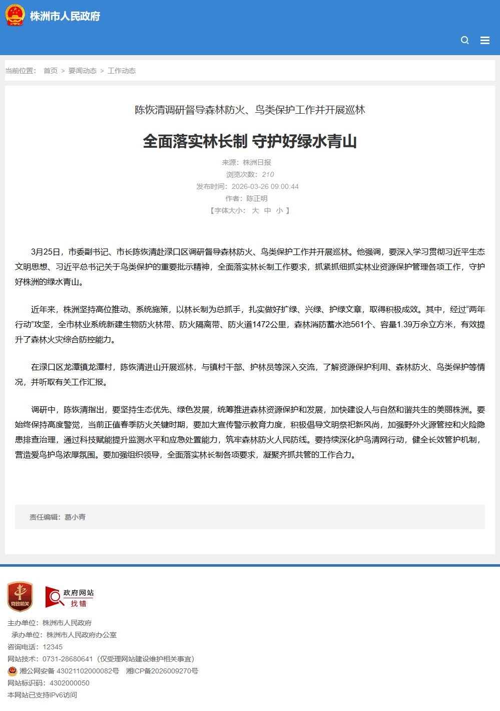 3月25日,市委副书记、市长陈恢清赴渌口区调研督导森林防火、鸟类保护工作并开展巡林。他强调,要深入学习贯彻习近平生态文明思想、习近平总书记关于鸟类保护的重要批示精神,全面落实林长制工作要求,抓紧抓细抓实林业资源保护管理各项工作,守护好株洲的绿水青山。