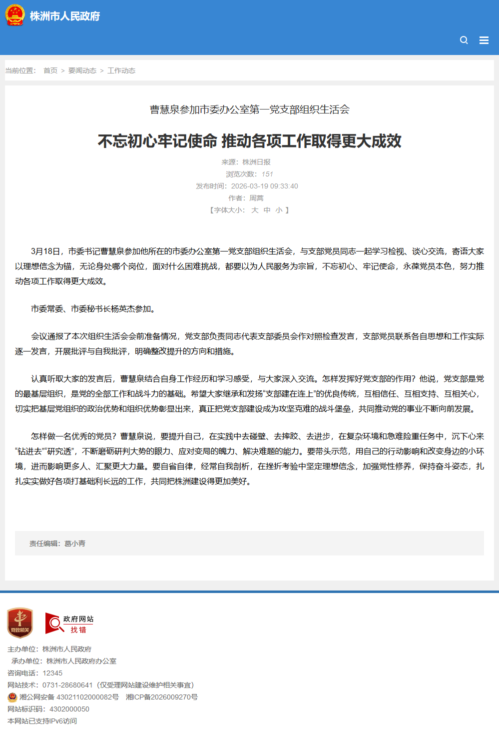 怎样做一名优秀的党员?曹慧泉说,要提升自己,在实践中去碰壁、去摔跤、去进步,在复杂环境和急难险重任务中,沉下心来“钻进去”“研究透”,不断磨砺研判大势的眼力、应对变局的魄力、解决难题的能力。要带头示范,用自己的行动影响和改变身边的小环境,进而影响更多人、汇聚更大力量。要自省自律,经常自我剖析,在挫折考验中坚定理想信念,加强党性修养,保持奋斗姿态,扎扎实实做好各项打基础利长远的工作,共同把株洲建设得更加美好。