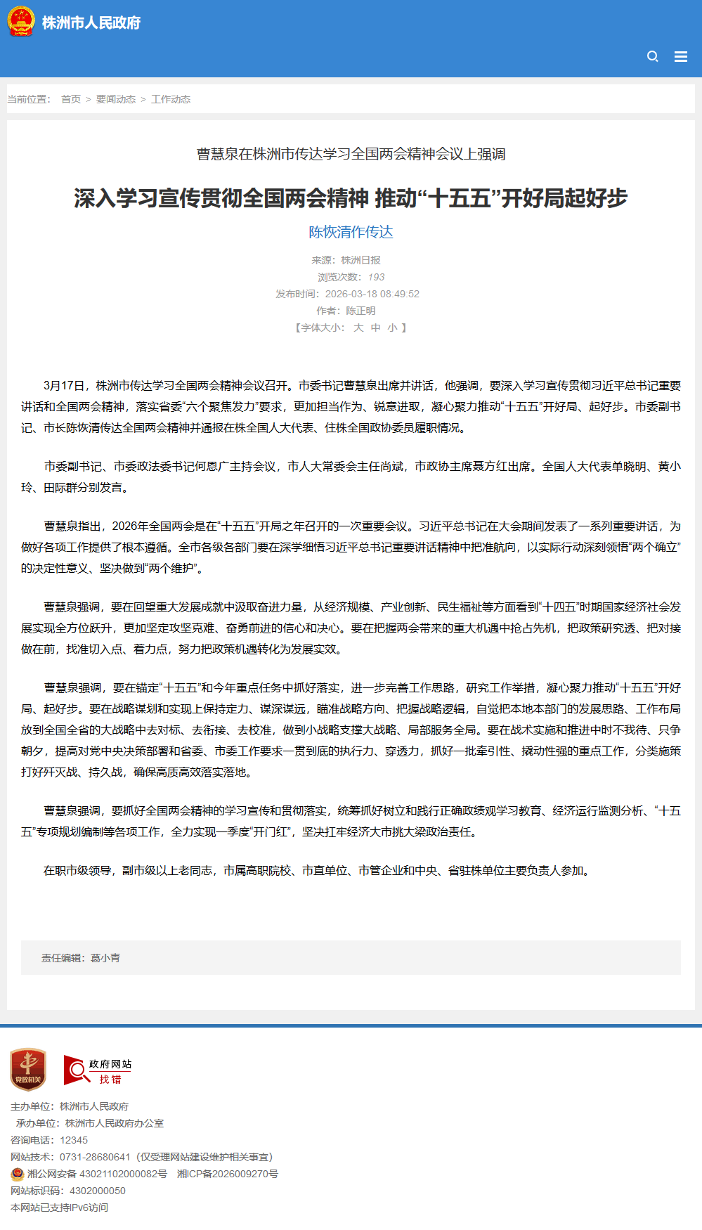 3月17日,株洲市传达学习全国两会精神会议召开。市委书记曹慧泉出席并讲话,他强调,要深入学习宣传贯彻习近平总书记重要讲话和全国两会精神,落实省委“六个聚焦发力”要求,更加担当作为、锐意进取,凝心聚力推动“十五五”开好局、起好步。市委副书记、市长陈恢清传达全国两会精神并通报在株全国人大代表、住株全国政协委员履职情况。