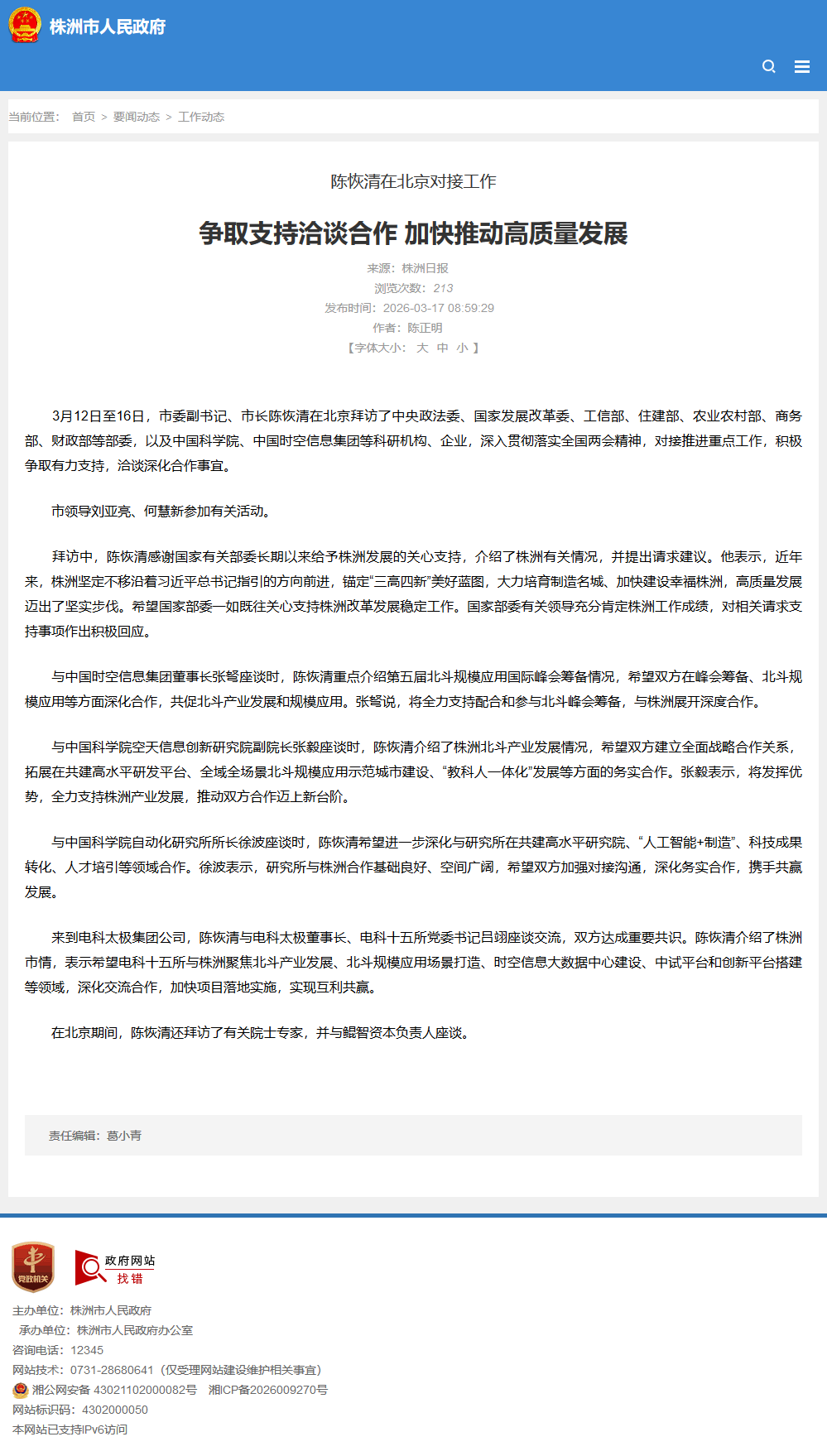 拜访中,陈恢清感谢国家有关部委长期以来给予株洲发展的关心支持,介绍了株洲有关情况,并提出请求建议。他表示,近年来,株洲坚定不移沿着习近平总书记指引的方向前进,锚定“三高四新”美好蓝图,大力培育制造名城、加快建设幸福株洲,高质量发展迈出了坚实步伐。希望国家部委一如既往关心支持株洲改革发展稳定工作。国家部委有关领导充分肯定株洲工作成绩,对相关请求支持事项作出积极回应。