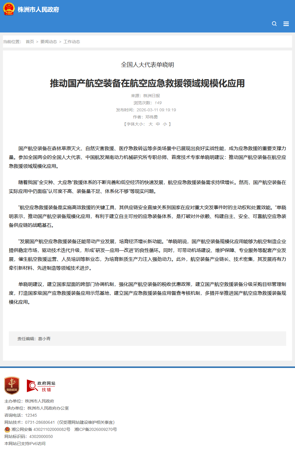 国产航空装备在森林草原灭火、自然灾害救援、医疗急救转运等多类场景中已展现出良好实战性能,成为应急救援的重要支撑力量。参加全国两会的全国人大代表、中国航发湖南动力机械研究所专职总师、首席技术专家单晓明建议:推动国产航空装备在航空应急救援领域规模化应用。