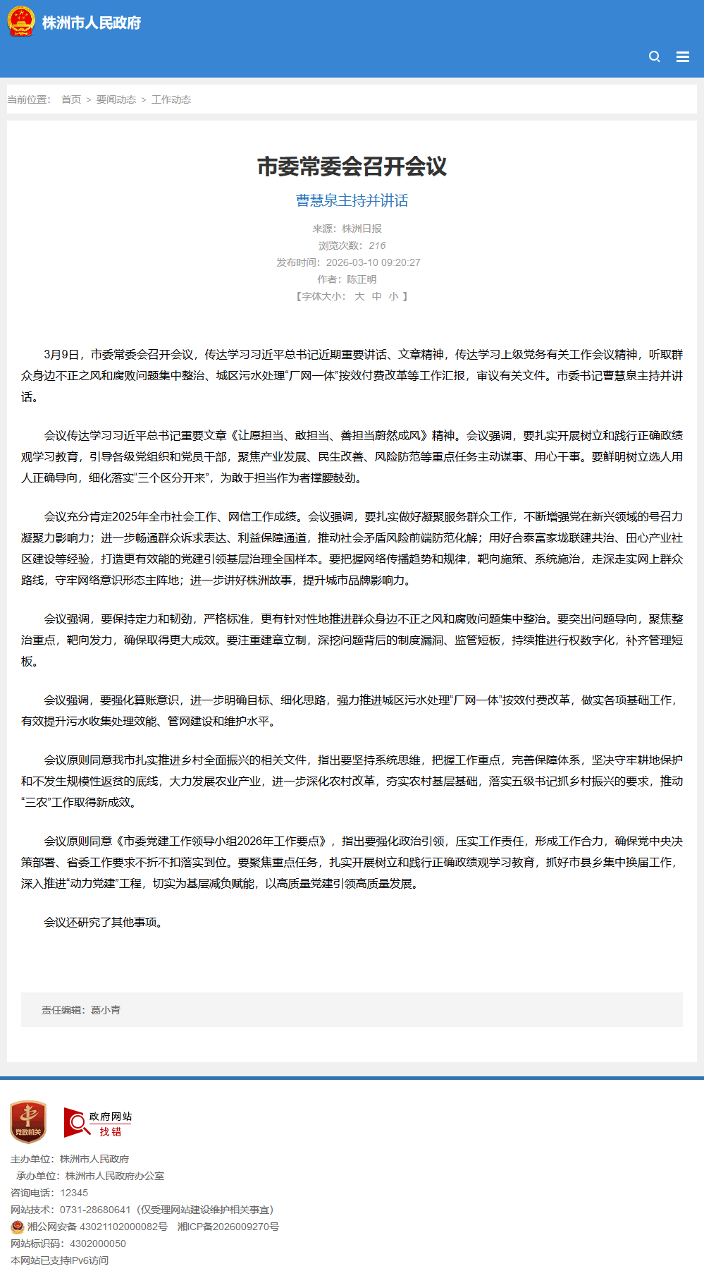 会议充分肯定2025年全市社会工作、网信工作成绩。会议强调,要扎实做好凝聚服务群众工作,不断增强党在新兴领域的号召力凝聚力影响力;进一步畅通群众诉求表达、利益保障通道,推动社会矛盾风险前端防范化解;用好合泰富家垅联建共治、田心产业社区建设等经验,打造更有效能的党建引领基层治理全国样本。要把握网络传播趋势和规律,靶向施策、系统施治,走深走实网上群众路线,守牢网络意识形态主阵地;进一步讲好株洲故事,提升城市品牌影响力。