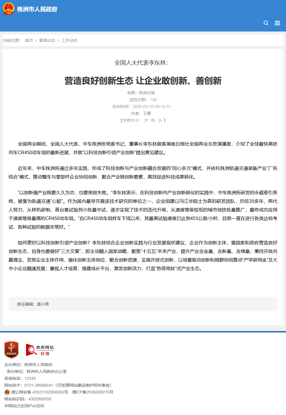 全国两会期间,全国人大代表、中车株洲所党委书记、董事长李东林做客湖南日报社全国两会北京演播室,介绍了全球最快高铁列车CR450动车组的最新进展,并就“以科技创新引领产业创新”提出意见建议。