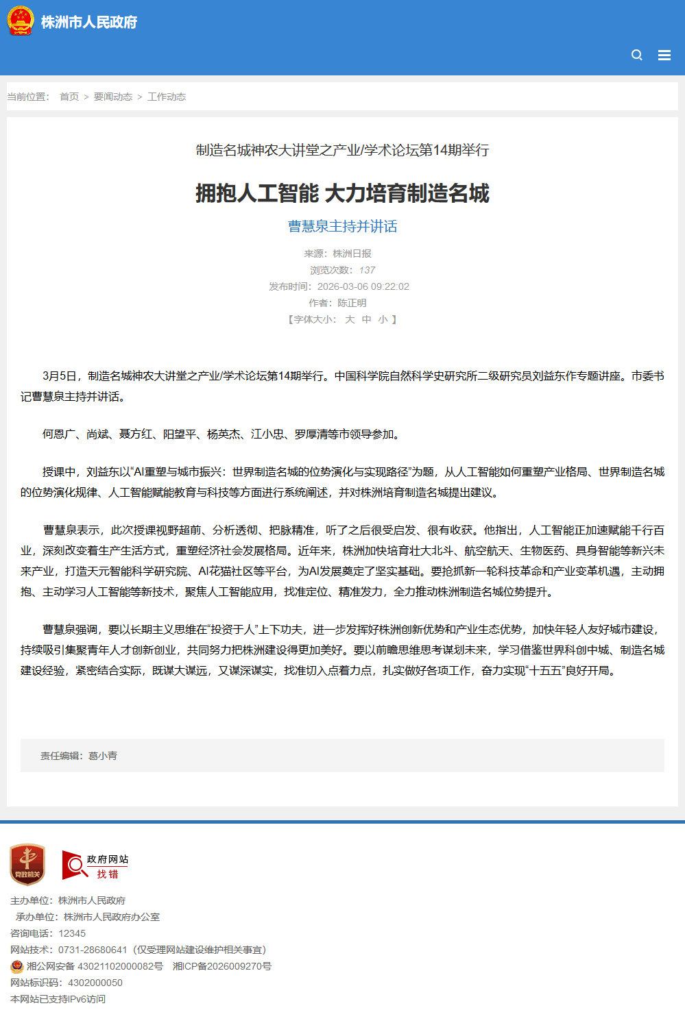 曹慧泉表示,此次授课视野超前、分析透彻、把脉精准,听了之后很受启发、很有收获。他指出,人工智能正加速赋能千行百业,深刻改变着生产生活方式,重塑经济社会发展格局。近年来,株洲加快培育壮大北斗、航空航天、生物医药、具身智能等新兴未来产业,打造天元智能科学研究院、AI花猫社区等平台,为AI发展奠定了坚实基础。要抢抓新一轮科技革命和产业变革机遇,主动拥抱、主动学习人工智能等新技术,聚焦人工智能应用,找准定位、精准发力,全力推动株洲制造名城位势提升。