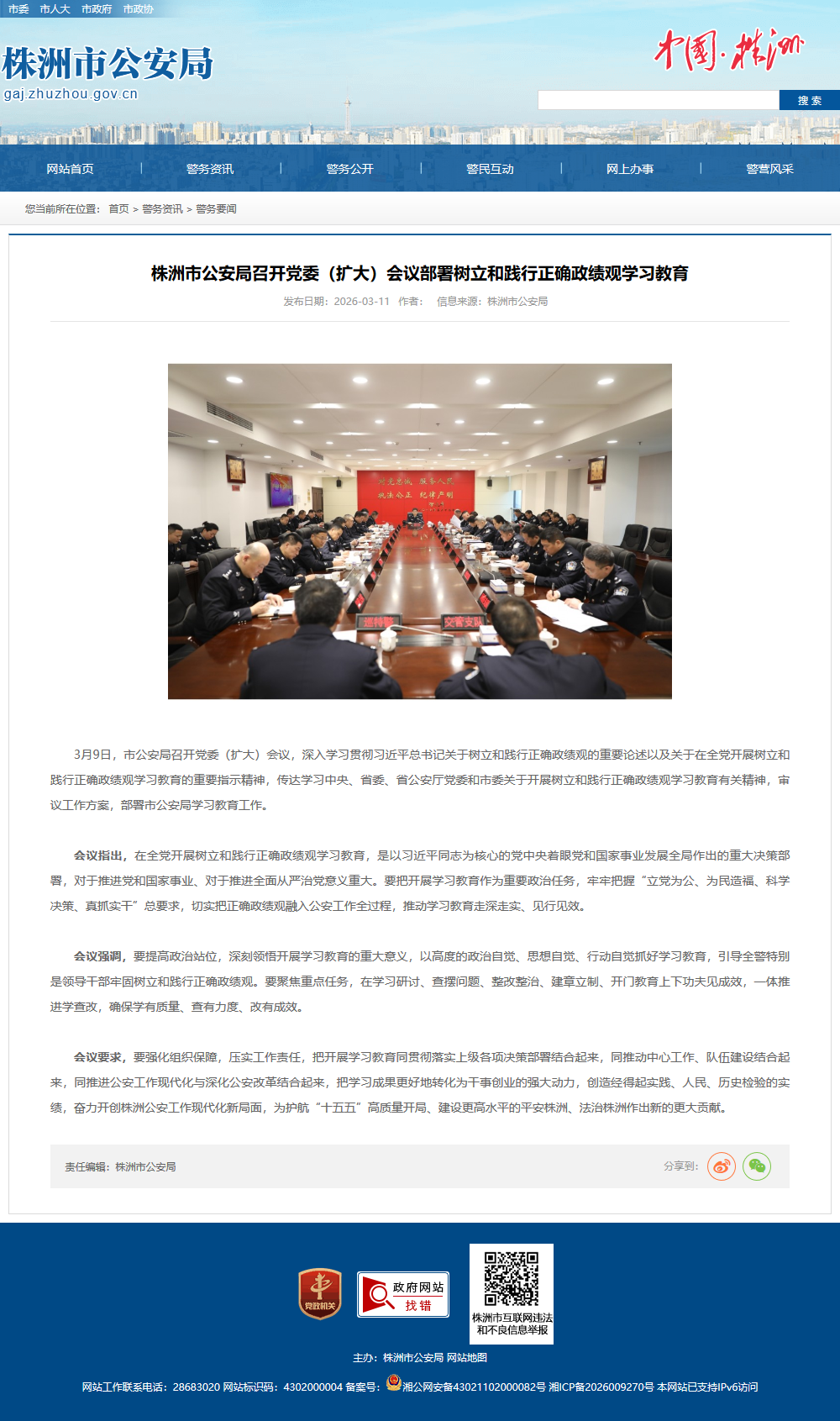 会议指出,在全党开展树立和践行正确政绩观学习教育,是以习近平同志为核心的党中央着眼党和国家事业发展全局作出的重大决策部署,对于推进党和国家事业、对于推进全面从严治党意义重大。要把开展学习教育作为重要政治任务,牢牢把握“立党为公、为民造福、科学决策、真抓实干”总要求,切实把正确政绩观融入公安工作全过程,推动学习教育走深走实、见行见效。