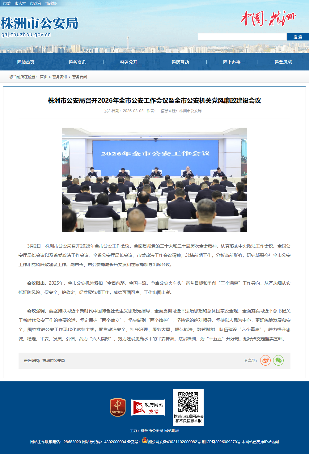 会议强调,要坚持以习近平新时代中国特色社会主义思想为指导,全面贯彻习近平法治思想和总体国家安全观,全面落实习近平总书记关于新时代公安工作的重要论述,坚定拥护“两个确立”,坚决做到“两个维护”,坚持党的绝对领导,坚持以人民为中心,更好统筹发展和安全,围绕推进公安工作现代化这条主线,聚焦政治安全、社会治理、服务大局、规范执法、数智赋能、队伍建设“六个重点”,着力提升忠诚、稳定、平安、发展、公信、战力“六大指数”,努力建设更高水平的平安株洲、法治株洲,为“十五五”开好局、起好步奠定坚实基础。