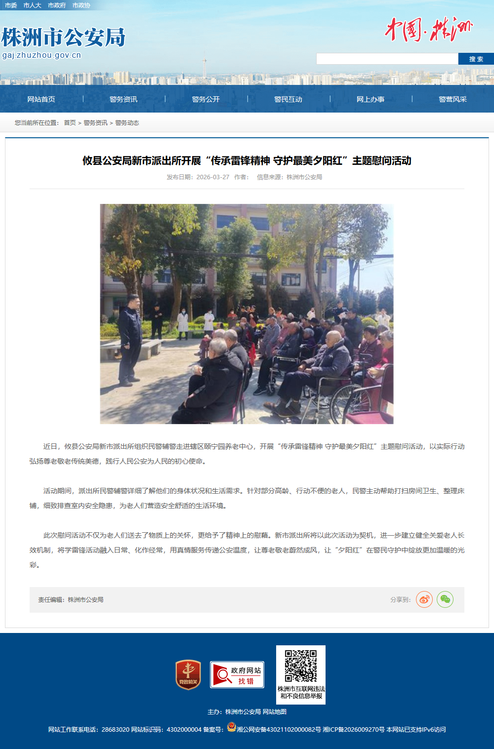 近日,攸县公安局新市派出所组织民警辅警走进辖区颐宁园养老中心,开展“传承雷锋精神 守护最美夕阳红”主题慰问活动,以实际行动弘扬尊老敬老传统美德,践行人民公安为人民的初心使命。