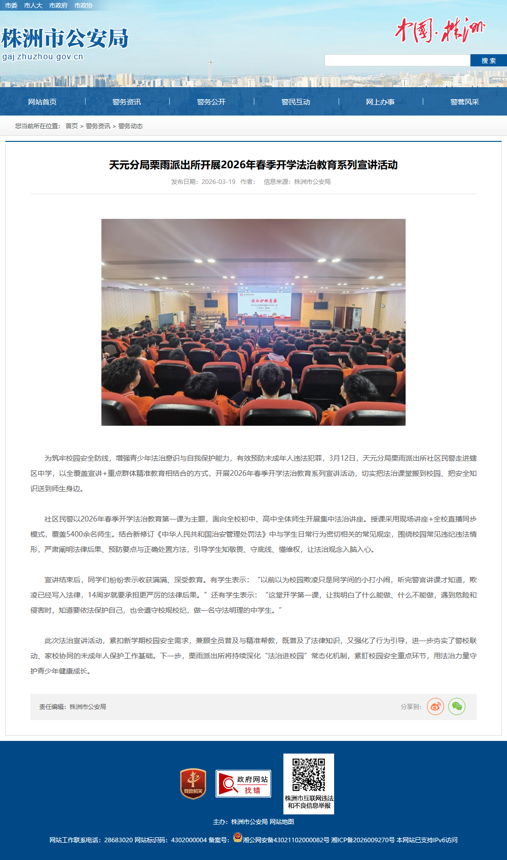 为筑牢校园安全防线,增强青少年法治意识与自我保护能力,有效预防未成年人违法犯罪,3月12日,天元分局栗雨派出所社区民警走进辖区中学,以全覆盖宣讲 重点群体精准教育相结合的方式,开展2026年春季开学法治教育系列宣讲活动,切实把法治课堂搬到校园、把安全知识送到师生身边。