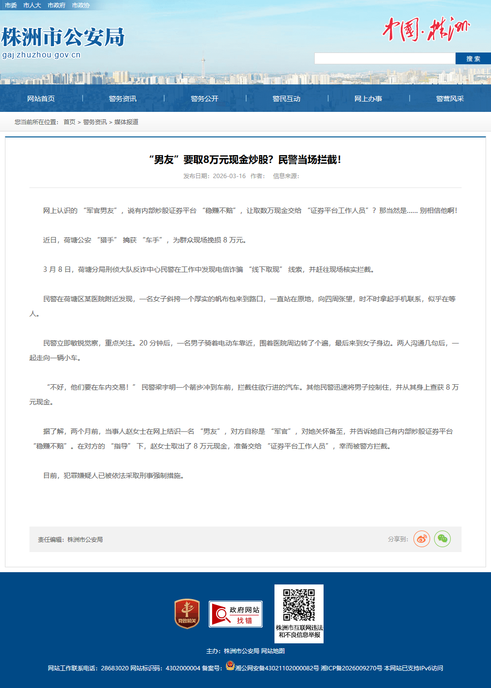 据了解,两个月前,当事人赵女士在网上结识一名 “男友”,对方自称是 “军官”,对她关怀备至,并告诉她自己有内部炒股证券平台 “稳赚不赔”。在对方的 “指导” 下,赵女士取出了 8 万元现金,准备交给 “证券平台工作人员”,幸而被警方拦截。
