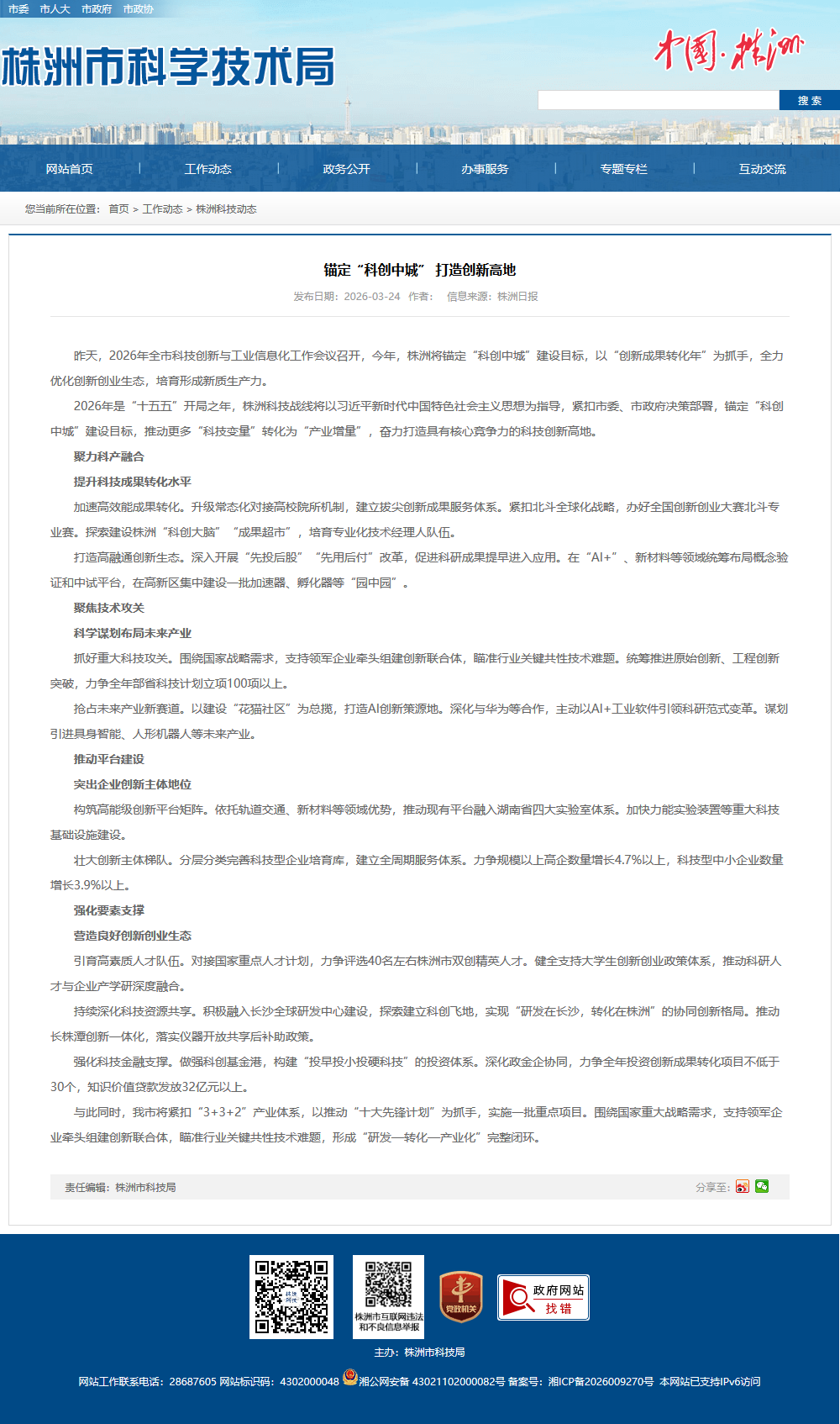 2026年是“十五五”开局之年,株洲科技战线将以习近平新时代中国特色社会主义思想为指导,紧扣市委、市政府决策部署,锚定“科创中城”建设目标,推动更多“科技变量”转化为“产业增量”,奋力打造具有核心竞争力的科技创新高地。