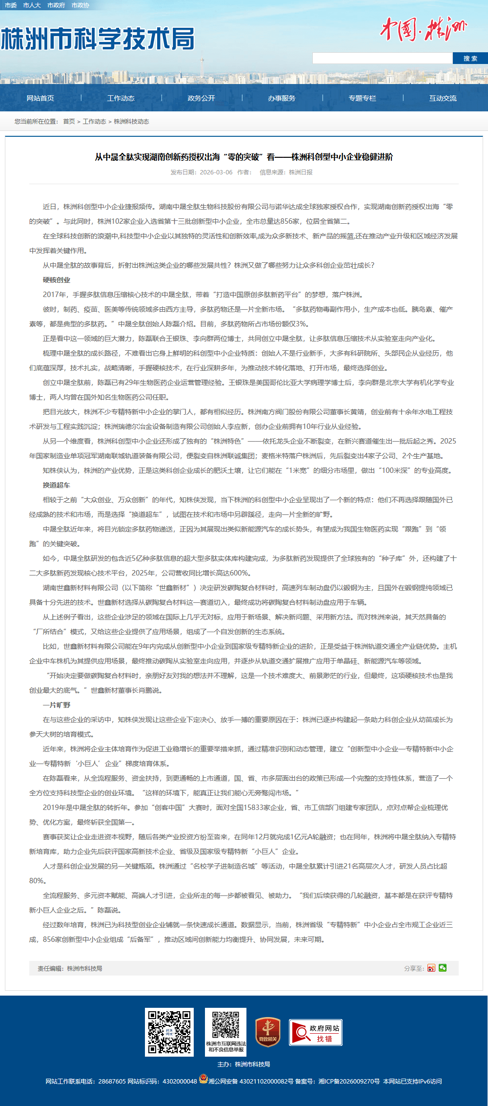 近日,株洲科创型中小企业捷报频传。湖南中晟全肽生物科技股份有限公司与诺华达成全球独家授权合作,实现湖南创新药授权出海“零的突破”。与此同时,株洲102家企业入选省第十三批创新型中小企业,全市总量达856家,位居全省第二。