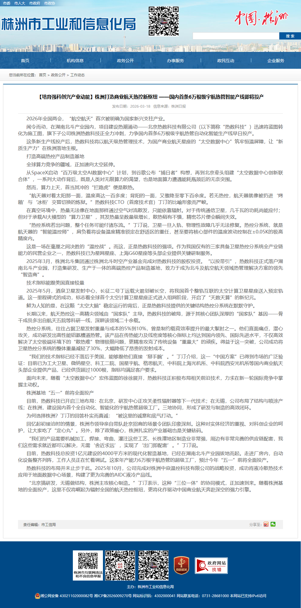 这条新生产线投产后,热数科技将以航天级热管理技术,为国产商业航天星座的“太空数据中心”筑牢恒温屏障,让“新质生产力”在株洲落地生根。