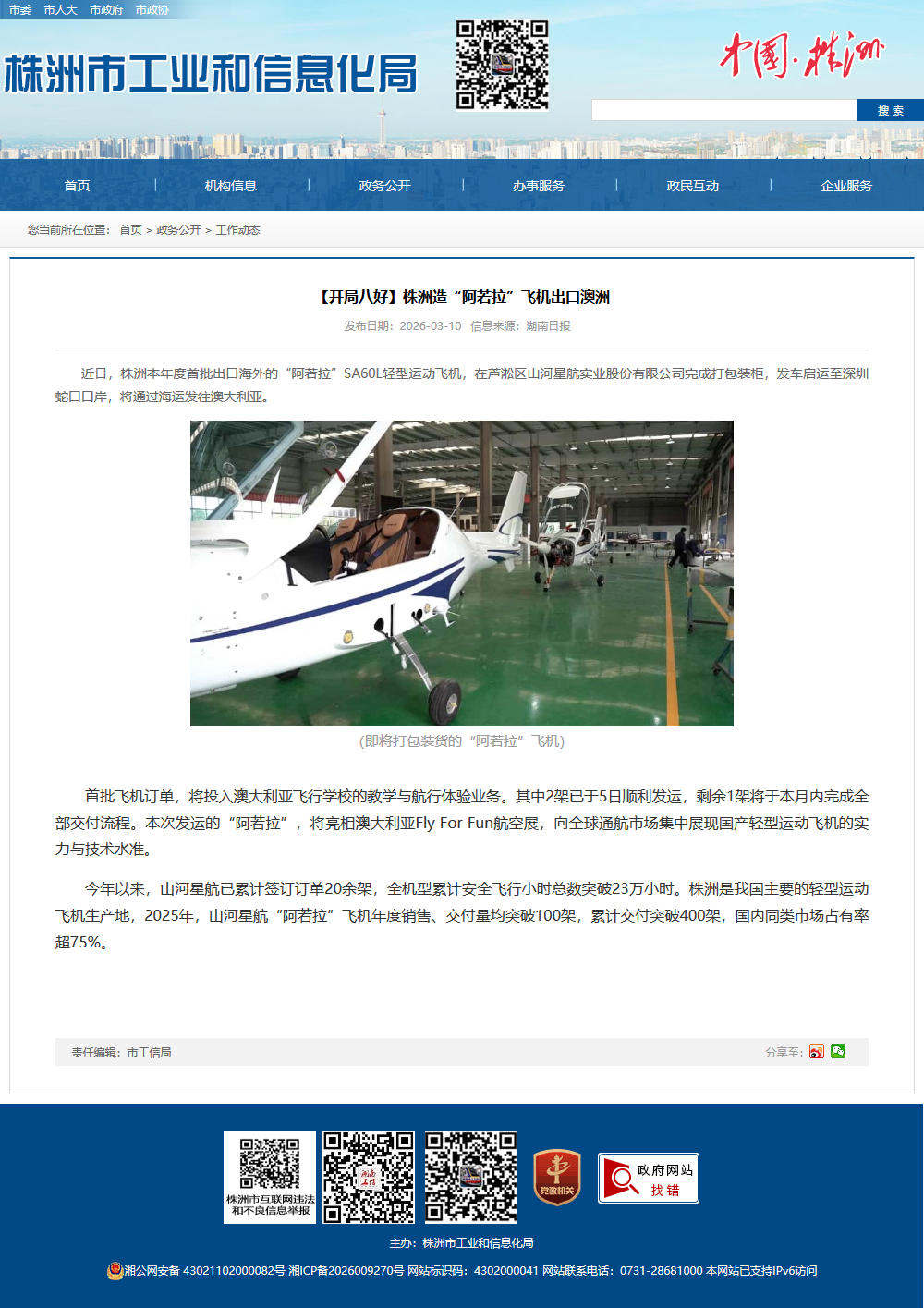 (即将打包装货的“阿若拉”飞机)首批飞机订单,将投入澳大利亚飞行学校的教学与航行体验业务。其中2架已于5日顺利发运,剩余1架将于本月内完成全部交付流程。本次发运的“阿若拉”,将亮相澳大利亚Fly For Fun航空展,向全球通航市场集中展现国产轻型运动飞机的实力与技术水准。 今年以来,山河星航已累计签订订单20余架,全机型累计安全飞行小时总数突破23万小时。株洲是我国主要的轻型运动飞机生产地,2025年,山河星航“阿若拉”飞机年度销售、交付量均突破100架,累计交付突破400架,国内同类市场占有率超75%。