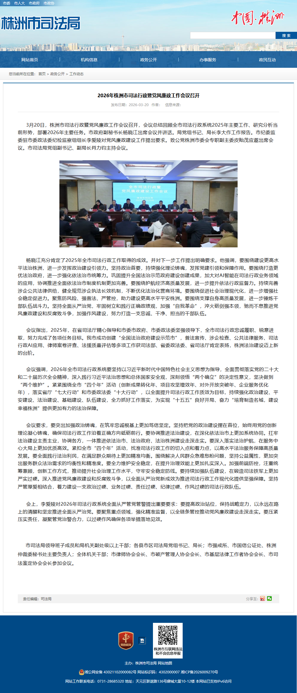 3月20日,株洲市司法行政暨党风廉政工作会议召开,会议总结回顾全市司法行政系统2025年主要工作、研究分析当前形势,部署2026年主要任务。市政府副秘书长杨晓江出席会议并讲话。局党组书记、局长李大作工作报告。市纪委监委驻市委政法委纪检监察组组长李爱陵对党风廉政建设工作提出要求。致公党株洲市委会专职副主委皮贻茂应邀出席会议。市司法局党组副书记、副局长肖力钧主持会议。