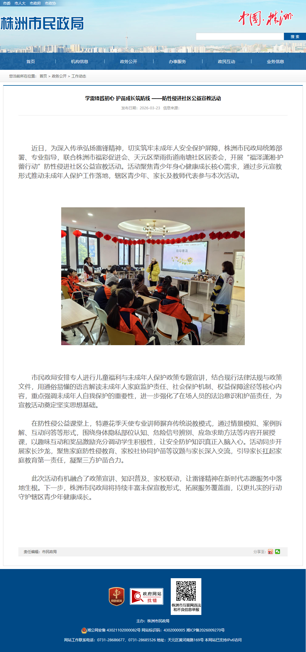 此次活动有机融合了政策宣讲、知识普及、家校联动,让雷锋精神在新时代志愿服务中落地生根。下一步,株洲市民政局将持续丰富未保宣教形式、拓展服务覆盖面,以更扎实的行动守护辖区青少年健康成长。