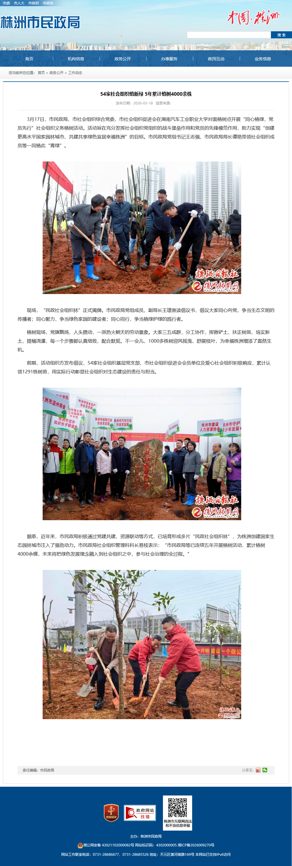 据悉,近年来,市民政局积极通过党建共建、资源联动等方式,已培育形成多片“民政社会组织林”,为株洲创建国家生态园林城市注入了强劲动力。市民政局社会组织管理科科长易枝表示:“市民政局等已连续五年开展植树活动,累计植树4000余棵,未来将把绿色发展理念融入到社会组织之中,参与社会治理的全过程。”