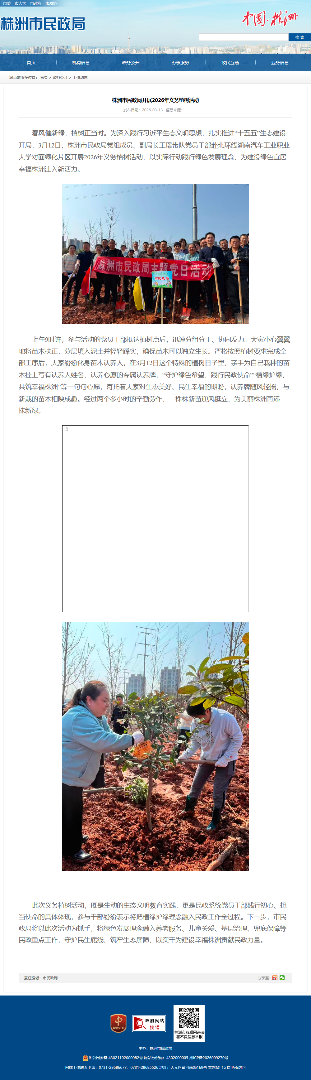 春风催新绿,植树正当时。为深入践行习近平生态文明思想,扎实推进“十五五”生态建设开局,3月12日,株洲市民政局党组成员、副局长王璟带队党员干部赴北环线湖南汽车工业职业大学对面绿化片区开展2026年义务植树活动,以实际行动践行绿色发展理念,为建设绿色宜居幸福株洲注入新活力。