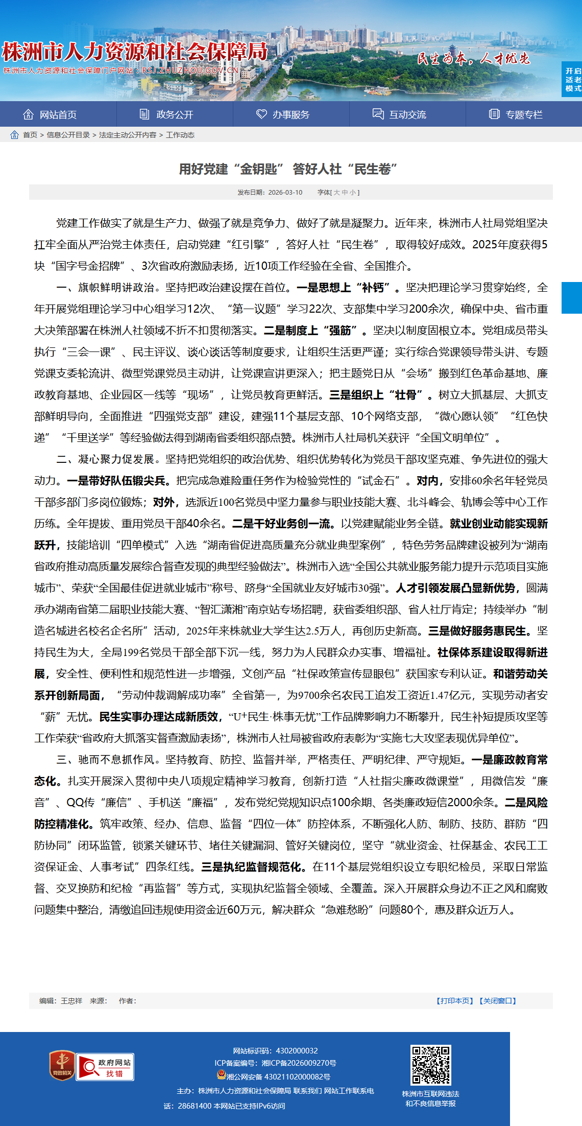二、凝心聚力促发展。坚持把党组织的政治优势、组织优势转化为党员干部攻坚克难、争先进位的强大动力。一是带好队伍锻尖兵。把完成急难险重任务作为检验党性的“试金石”。对内,安排60余名年轻党员干部多部门多岗位锻炼;对外,选派近100名党员中坚力量参与职业技能大赛、北斗峰会、轨博会等中心工作历练。全年提拔、重用党员干部40余名。二是干好业务创一流。以党建赋能业务全链。就业创业动能实现新跃升,技能培训“四单模式”入选“湖南省促进高质量充分就业典型案例”,特色劳务品牌建设被列为“湖南省政府推动高质量发展综合督查发现的典型经验做法”。株洲市入选“全国公共就业服务能力提升示范项目实施城市”、荣获“全国最佳促进就业城市”称号、跻身“全国就业友好城市30强”。人才引领发展凸显新优势,圆满承办湖南省第二届职业技能大赛、“智汇潇湘”南京站专场招聘,获省委组织部、省人社厅肯定;持续举办“制造名城进名校名企名所”活动,2025年来株就业大学生达2.5万人,再创历史新高。三是做好服务惠民生。坚持民生为大,全局199名党员干部全部下沉一线,努力为人民群众办实事、增福祉。社保体系建设取得新进展,安全性、便利性和规范性进一步增强,文创产品“社保政策宣传显眼包”获国家专利认证。和谐劳动关系开创新局面,“劳动仲裁调解成功率”全省第一,为9700余名农民工追发工资近1.47亿元,实现劳动者安“薪”无忧。民生实事办理达成新质效,“U 民生·株事无忧”工作品牌影响力不断攀升,民生补短提质攻坚等工作荣获“省政府大抓落实督查激励表扬”,株洲市人社局被省政府表彰为“实施七大攻坚表现优异单位”。
