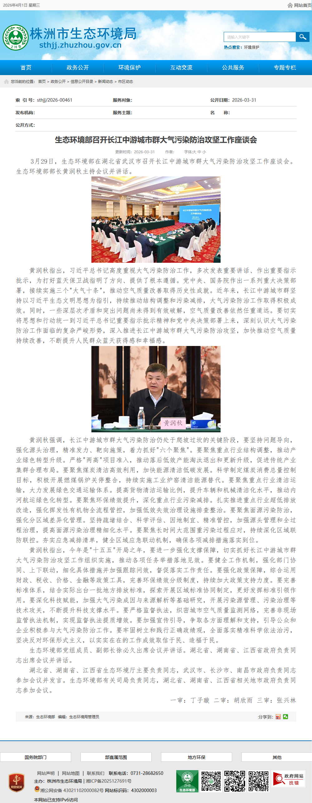 黄润秋指出,习近平总书记高度重视大气污染防治工作,多次发表重要讲话、作出重要指示批示,为打好蓝天保卫战指明了方向、提供了根本遵循。党中央、国务院作出一系列重大决策部署,接续实施三个"大气十条",推动空气质量改善取得历史性成就。近年来,长江中游城市群坚持以习近平生态文明思想为指引,持续推动结构调整和污染减排,大气污染防治工作取得积极成效。同时,一些深层次矛盾和突出问题尚未得到有效破解,空气质量改善依然任重道远。要切实将思想和行动统一到习近平总书记重要指示批示精神和党中央决策部署上来,深刻认识大气污染防治工作面临的复杂严峻形势,深入推进长江中游城市群大气污染防治攻坚,加快推动空气质量持续改善,不断提升人民群众蓝天获得感和幸福感。