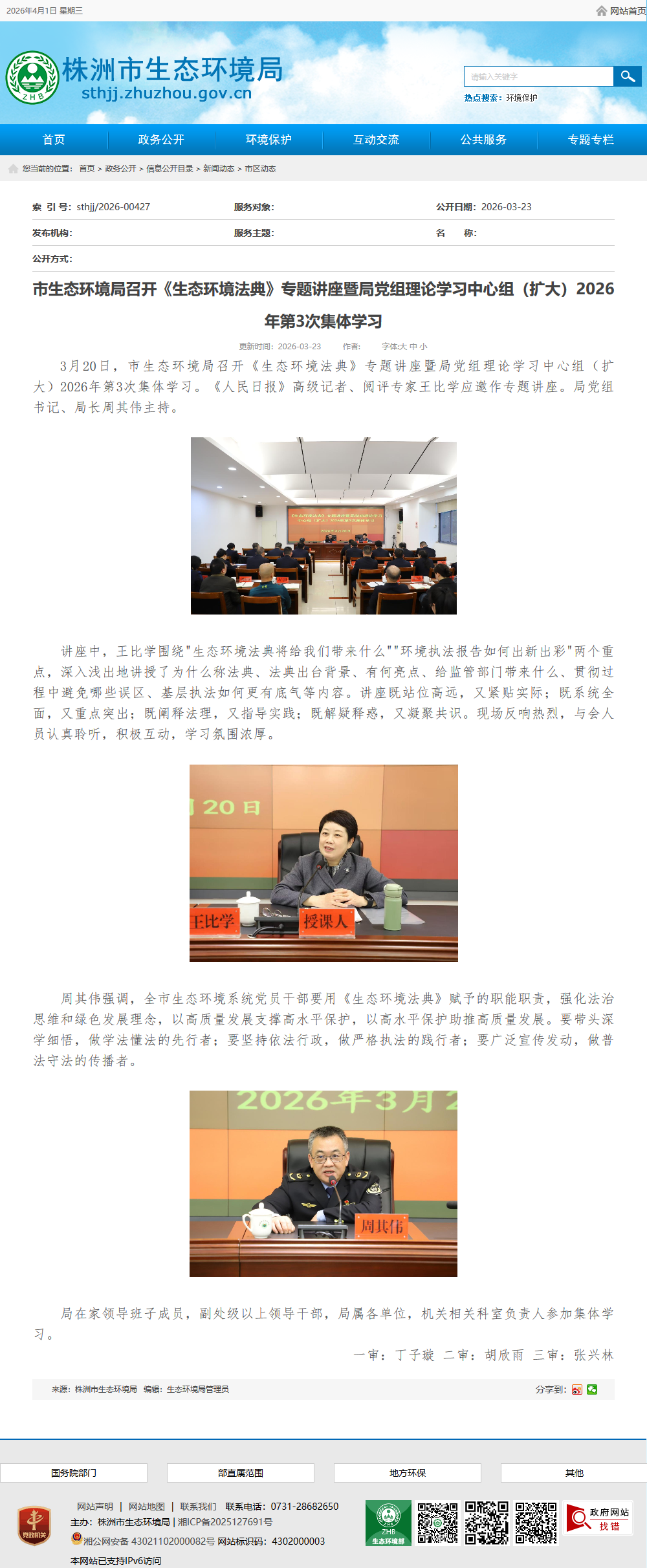 3月20日,市生态环境局召开《生态环境法典》专题讲座暨局党组理论学习中心组(扩大)2026年第3次集体学习。《人民日报》高级记者、阅评专家王比学应邀作专题讲座。局党组书记、局长周其伟主持。