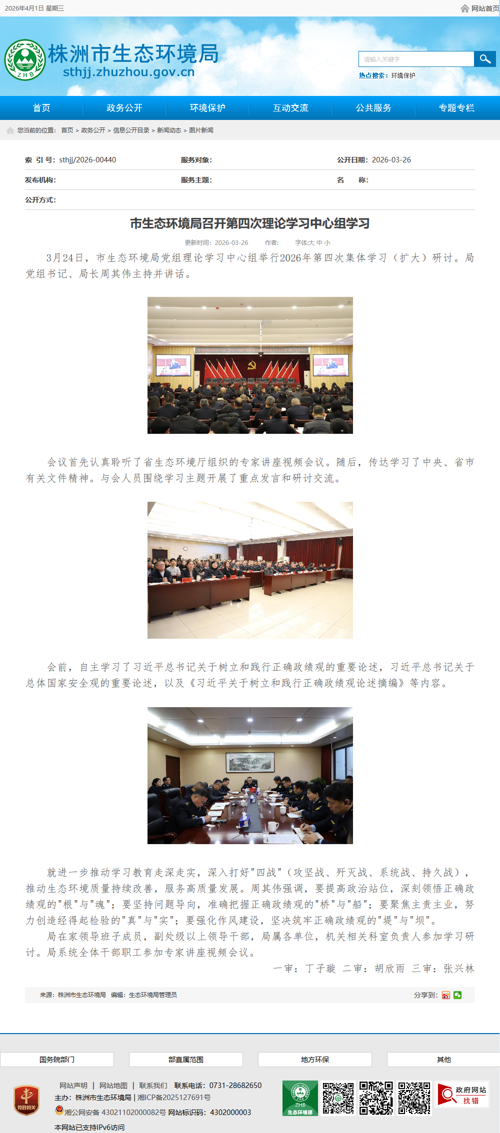 3月24日,市生态环境局党组理论学习中心组举行2026年第四次集体学习(扩大)研讨。局党组书记、局长周其伟主持并讲话。