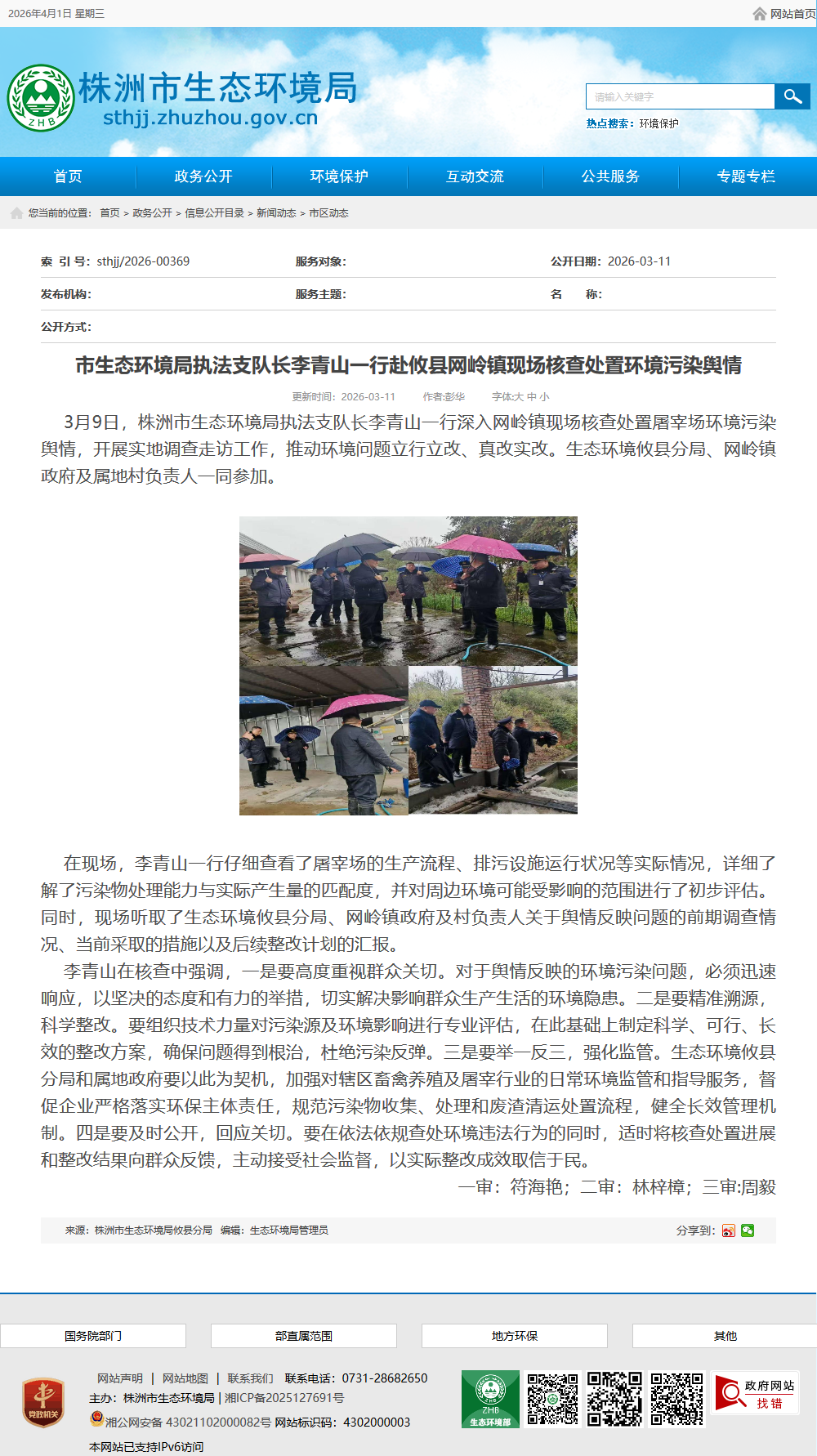 李青山在核查中强调,一是要高度重视群众关切。对于舆情反映的环境污染问题,必须迅速响应,以坚决的态度和有力的举措,切实解决影响群众生产生活的环境隐患。二是要精准溯源,科学整改。要组织技术力量对污染源及环境影响进行专业评估,在此基础上制定科学、可行、长效的整改方案,确保问题得到根治,杜绝污染反弹。三是要举一反三,强化监管。生态环境攸县分局和属地政府要以此为契机,加强对辖区畜禽养殖及屠宰行业的日常环境监管和指导服务,督促企业严格落实环保主体责任,规范污染物收集、处理和废渣清运处置流程,健全长效管理机制。四是要及时公开,回应关切。要在依法依规查处环境违法行为的同时,适时将核查处置进展和整改结果向群众反馈,主动接受社会监督,以实际整改成效取信于民。