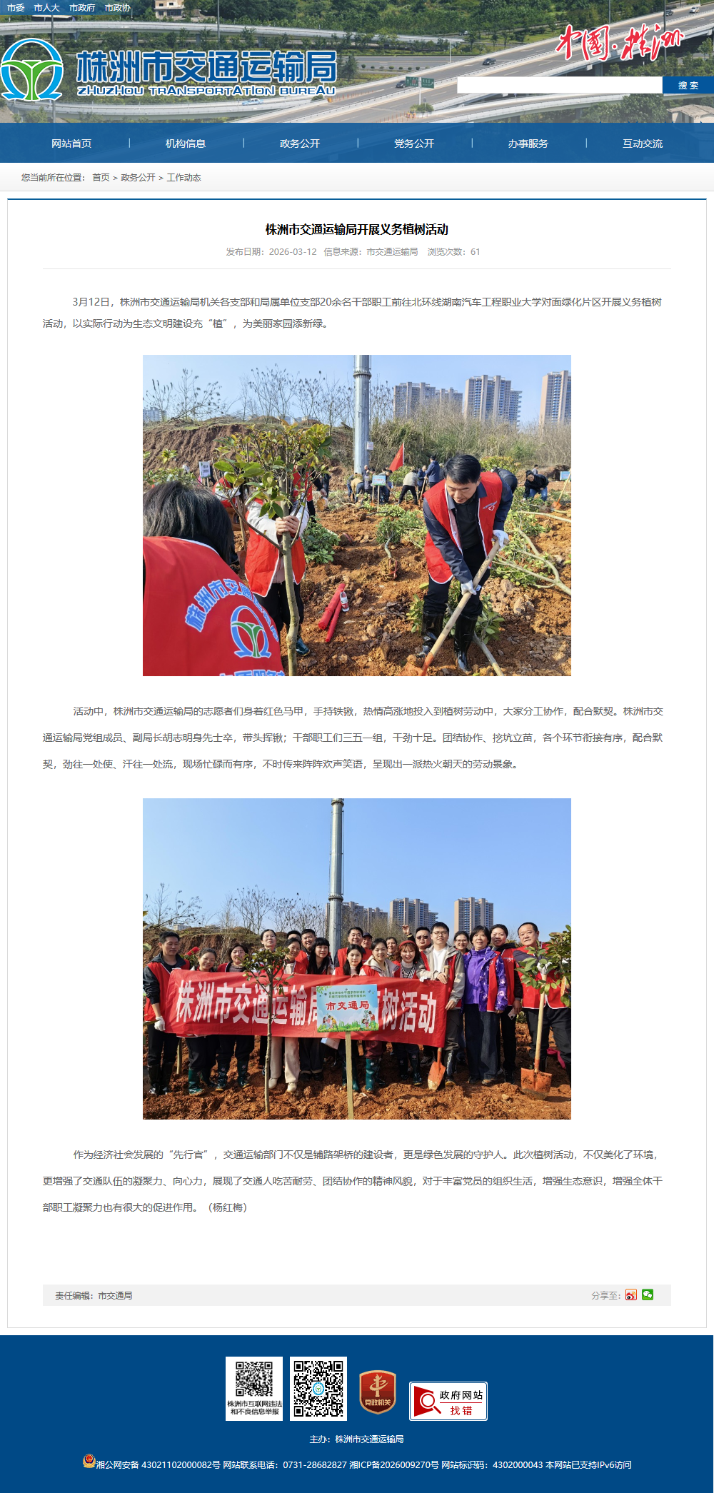 3月12日,株洲市交通运输局机关各支部和局属单位支部20余名干部职工前往北环线湖南汽车工程职业大学对面绿化片区开展义务植树活动,以实际行动为生态文明建设充“植”,为美丽家园添新绿。