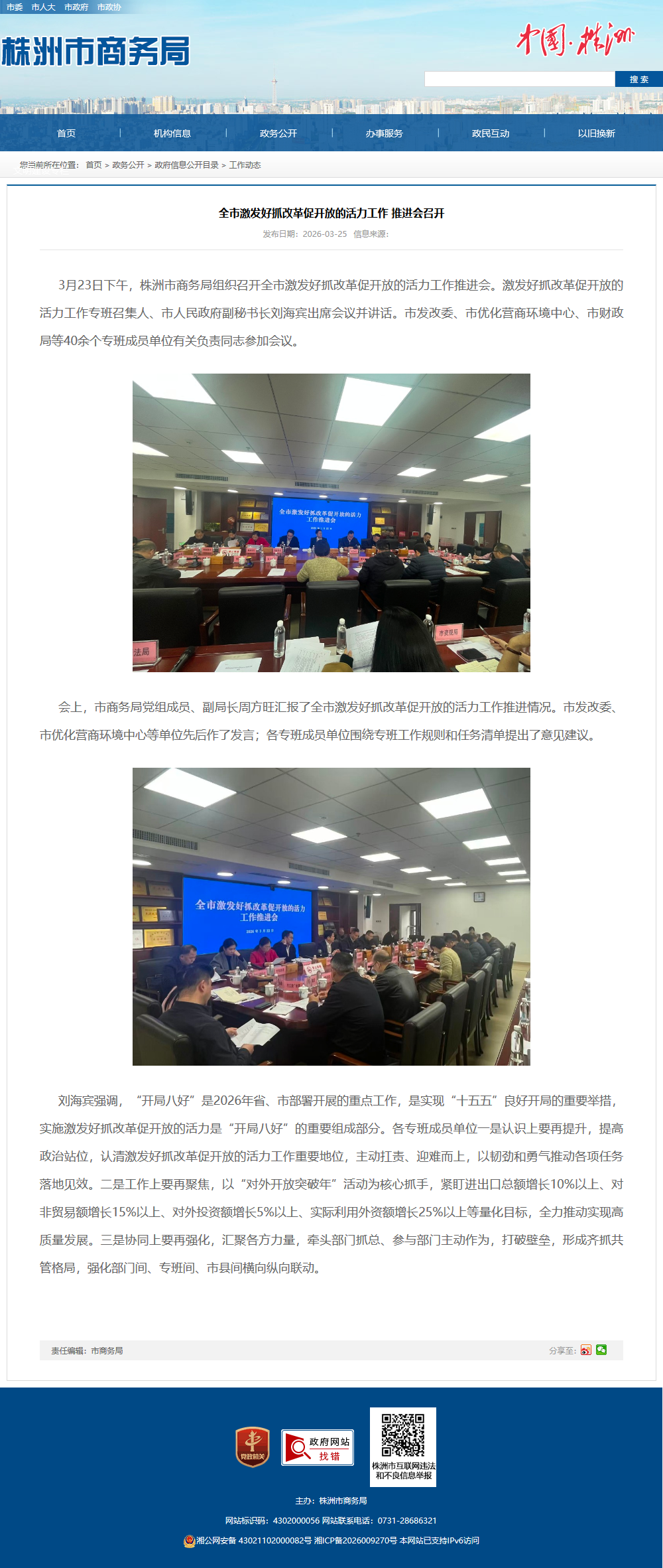 3月23日下午,株洲市商务局组织召开全市激发好抓改革促开放的活力工作推进会。激发好抓改革促开放的活力工作专班召集人、市人民政府副秘书长刘海宾出席会议并讲话。市发改委、市优化营商环境中心、市财政局等40余个专班成员单位有关负责同志参加会议。