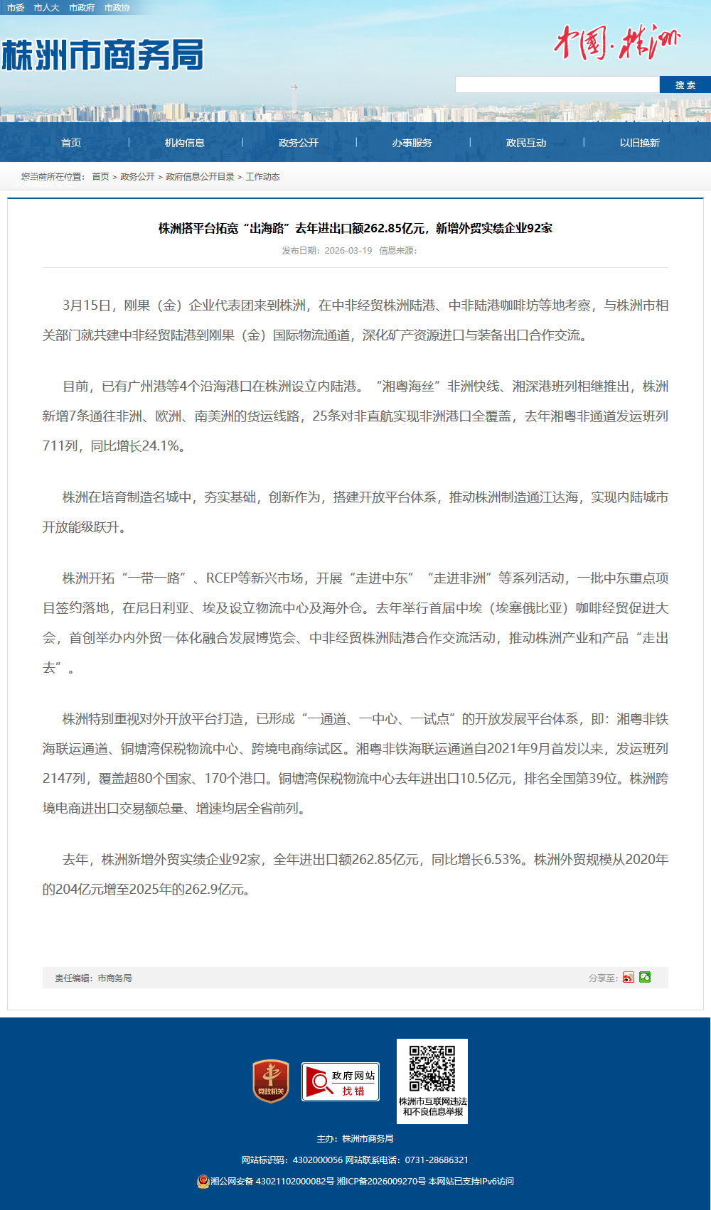 去年,株洲新增外贸实绩企业92家,全年进出口额262.85亿元,同比增长6.53%。株洲外贸规模从2020年的204亿元增至2025年的262.9亿元。