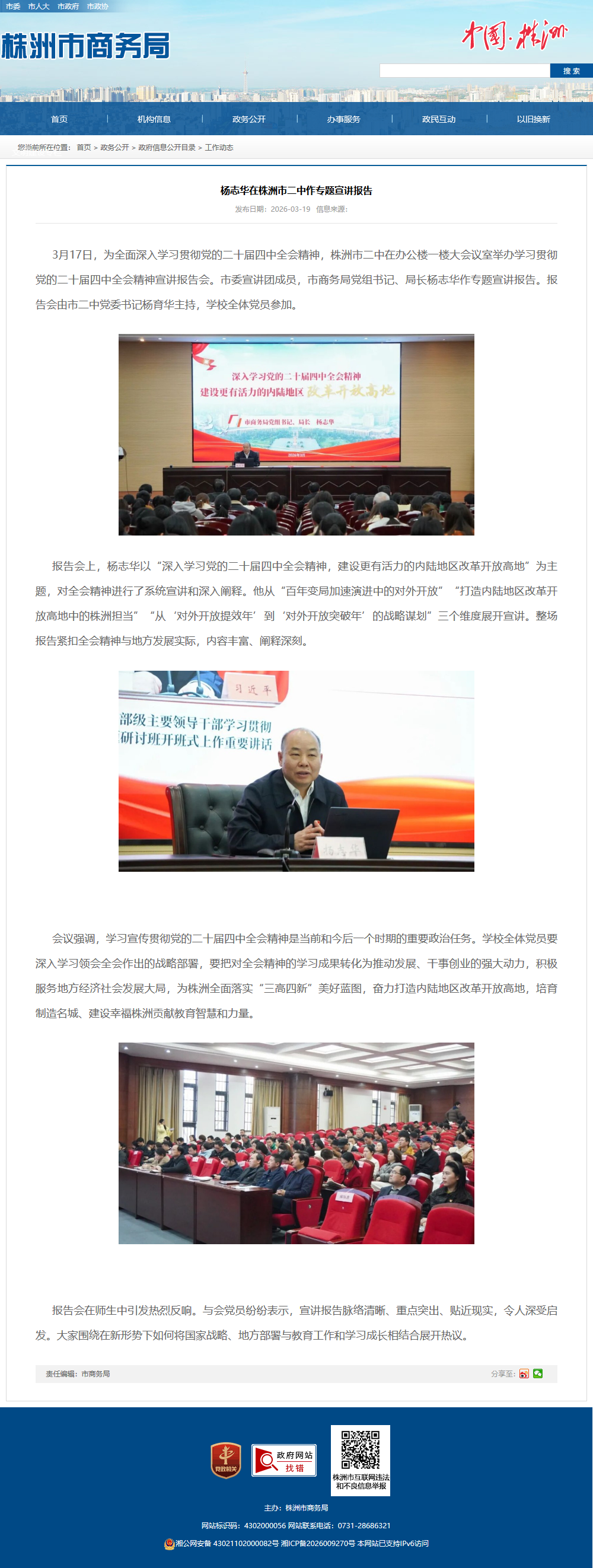3月17日,为全面深入学习贯彻党的二十届四中全会精神,株洲市二中在办公楼一楼大会议室举办学习贯彻党的二十届四中全会精神宣讲报告会。市委宣讲团成员,市商务局党组书记、局长杨志华作专题宣讲报告。报告会由市二中党委书记杨育华主持,学校全体党员参加。