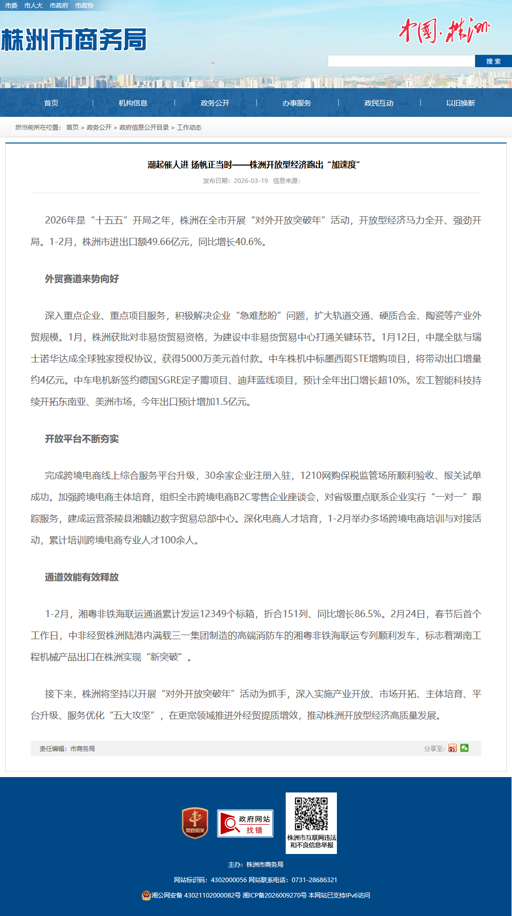 2026年是“十五五”开局之年,株洲在全市开展“对外开放突破年”活动,开放型经济马力全开、强劲开局。1-2月,株洲市进出口额49.66亿元,同比增长40.6%。
