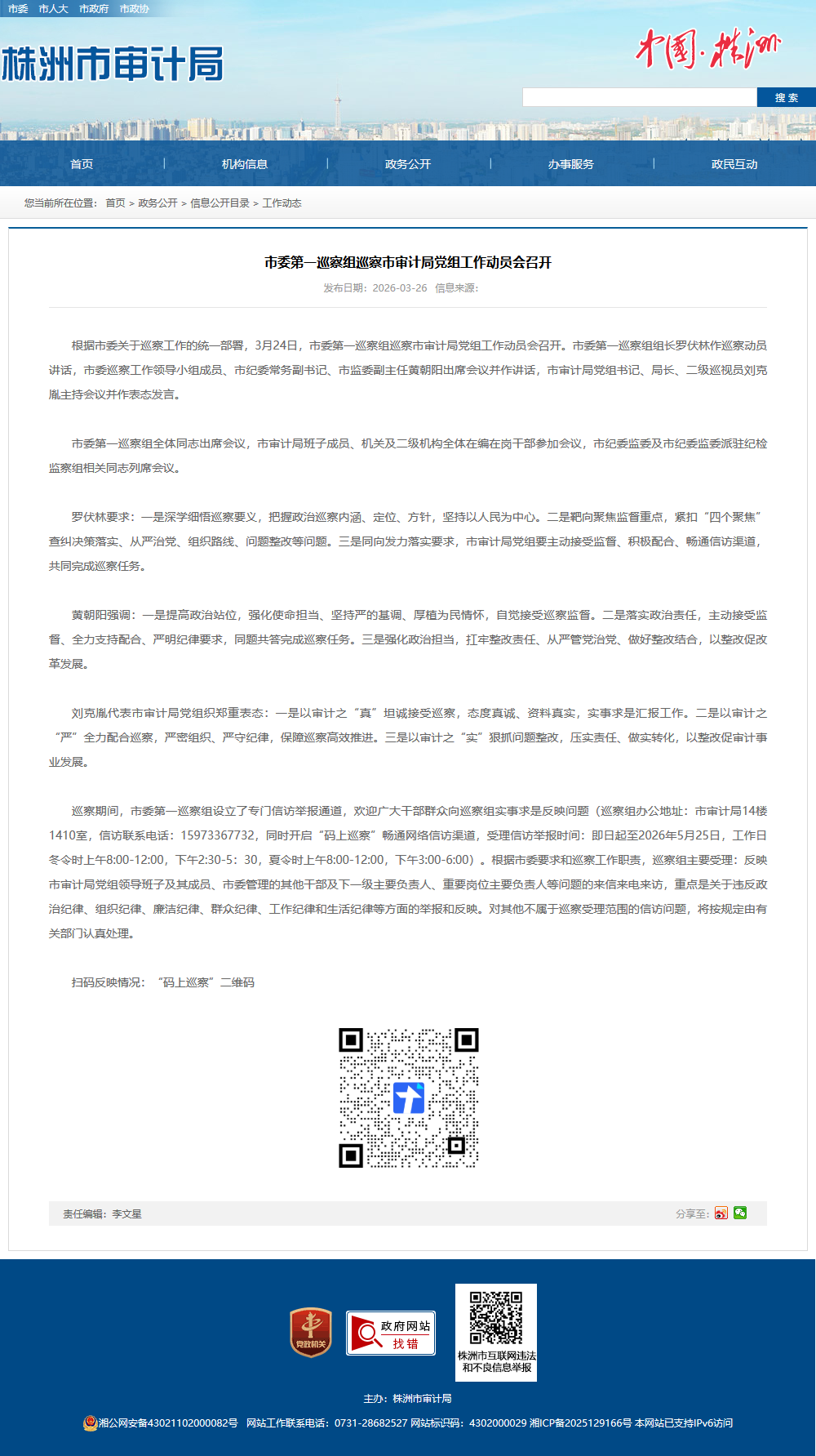 巡察期间,市委第一巡察组设立了专门信访举报通道,欢迎广大干部群众向巡察组实事求是反映问题(巡察组办公地址:市审计局14楼1410室,信访联系电话:15973367732,同时开启“码上巡察”畅通网络信访渠道,受理信访举报时间:即日起至2026年5月25日,工作日冬令时上午8:00-12:00,下午2:30-5:30,夏令时上午8:00-12:00,下午3:00-6:00)。根据市委要求和巡察工作职责,巡察组主要受理:反映市审计局党组领导班子及其成员、市委管理的其他干部及下一级主要负责人、重要岗位主要负责人等问题的来信来电来访,重点是关于违反政治纪律、组织纪律、廉洁纪律、群众纪律、工作纪律和生活纪律等方面的举报和反映。对其他不属于巡察受理范围的信访问题,将按规定由有关部门认真处理。